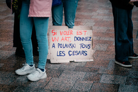 Rally organized by the feminist collective 'Nous Toutes' against the release of Roman Polanski's latest film 'The Palace' in front of the Pathé theater in Toulouse, southwest of France, on May 15, 2024.