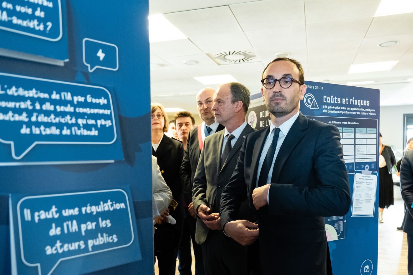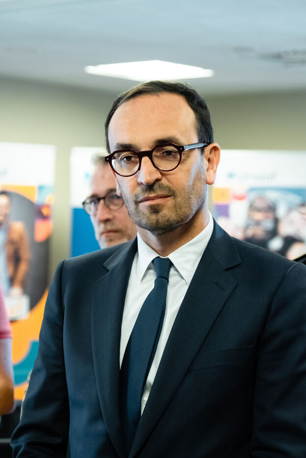 Présentation à l'URSSAF par le ministre des Comptes Publics du déploiement de l'intelligence artificielle (IA) générative avec des voicebots, chatbots et livechats destinée à renforcer le service à l'usager à Labège, sud-ouest de la France, le 24 mai 2024.