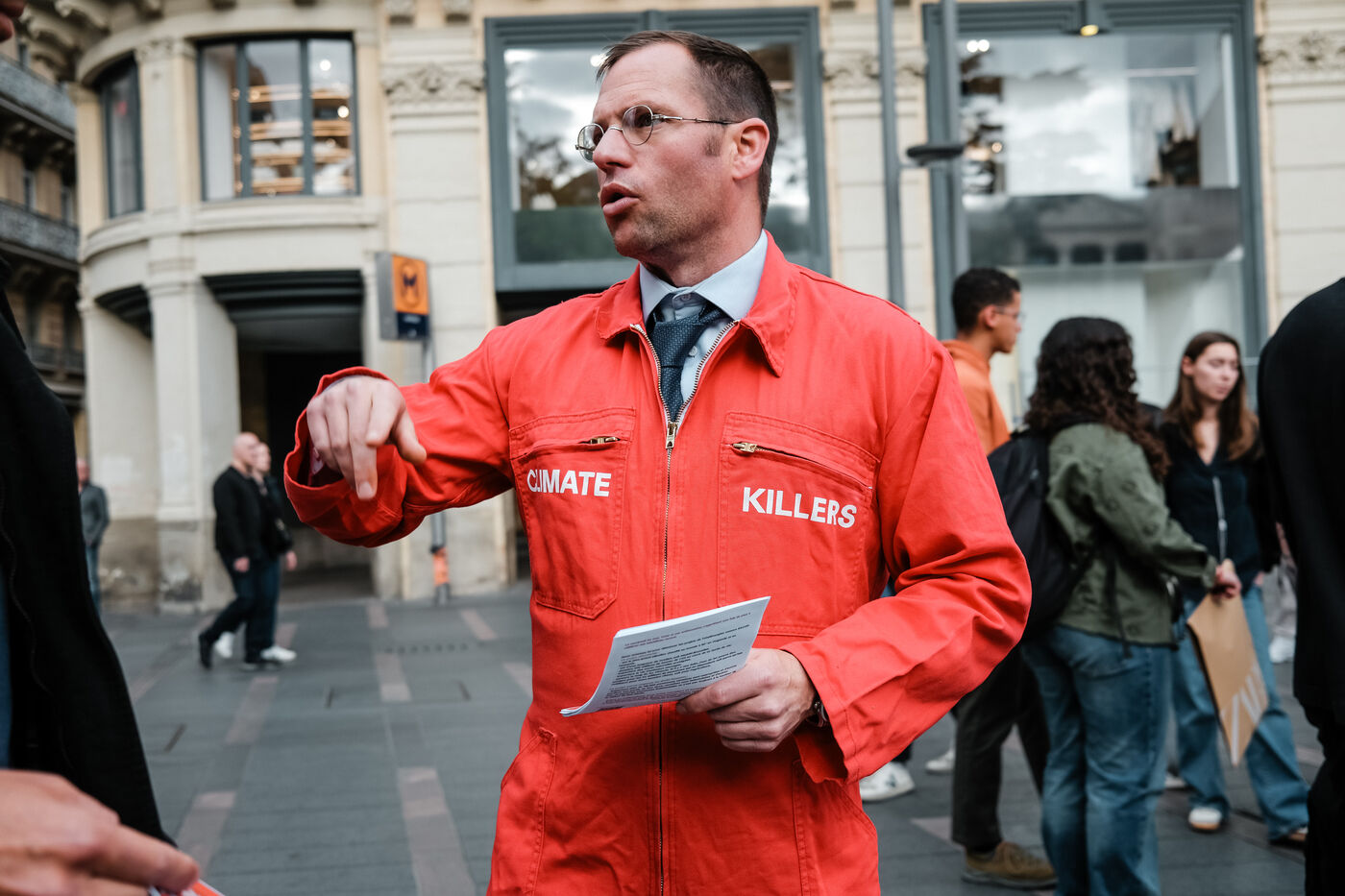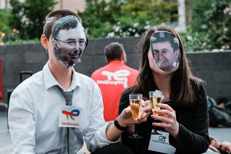 Action contre l'assemblée générale des actionnaires du groupe TotalEnergies par les membres du collectif StopTotal pour s'opposer à ses projets climaticides sur fond de bénéfices record à Toulouse, sud-ouest de la France, le 24 mai 2024.