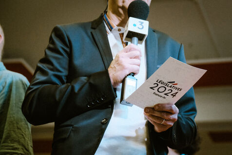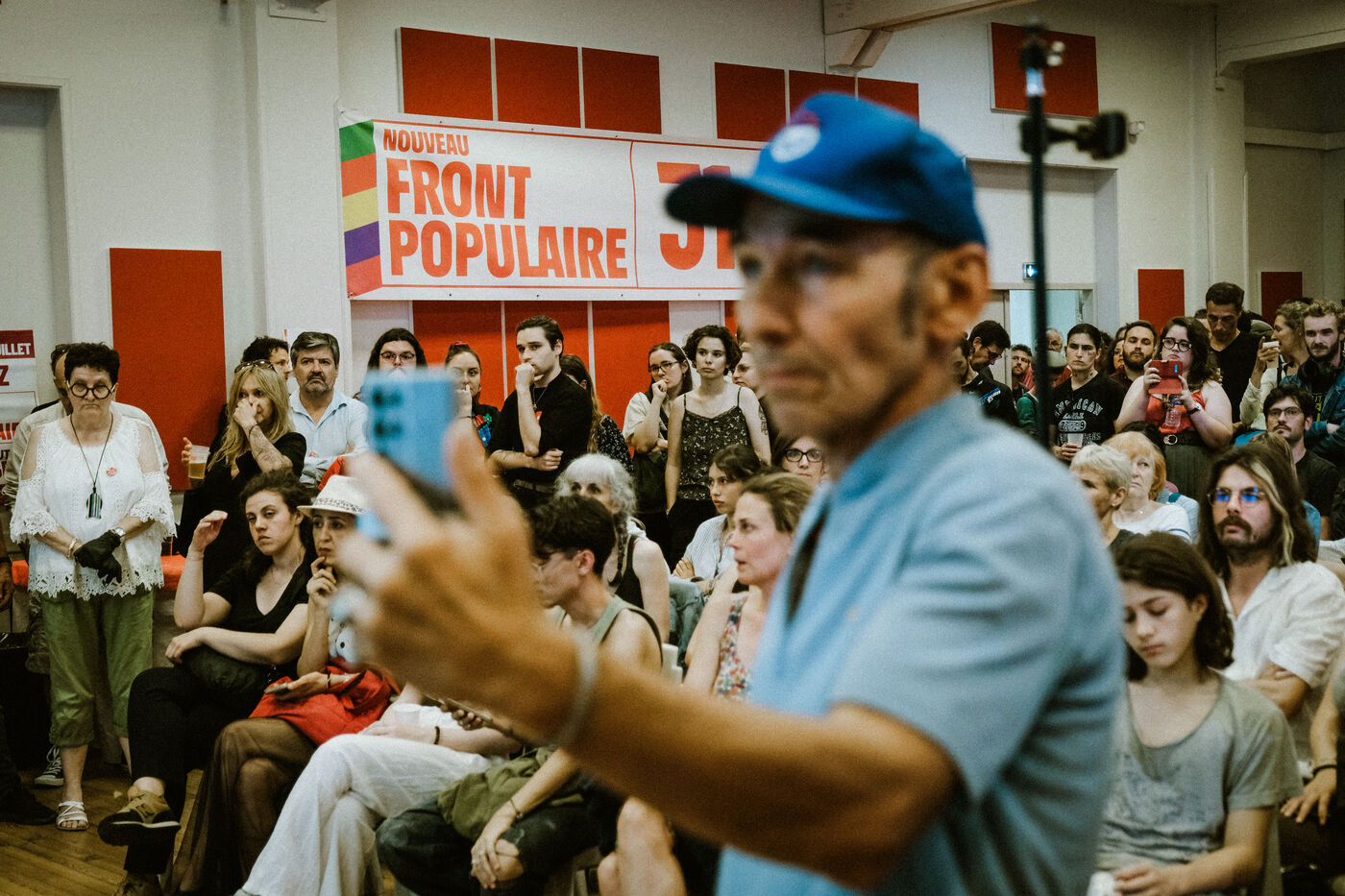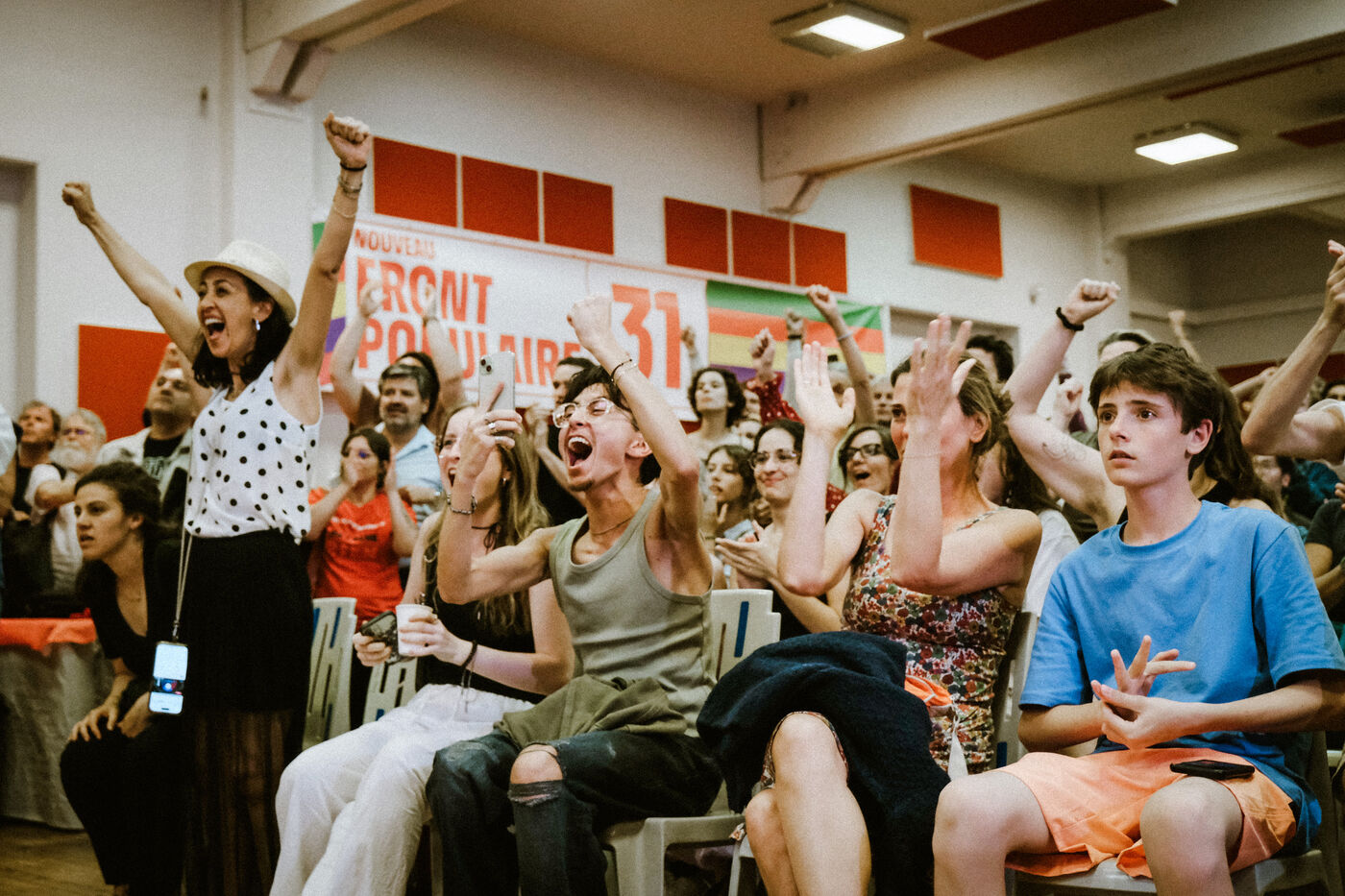 Soirée des résultats du second tour des élections législatives 2024 suite à la dissolution de l'assemblée nationale à la Bourse du Travail de la CGT à Toulouse, le 7 juillet 2024.