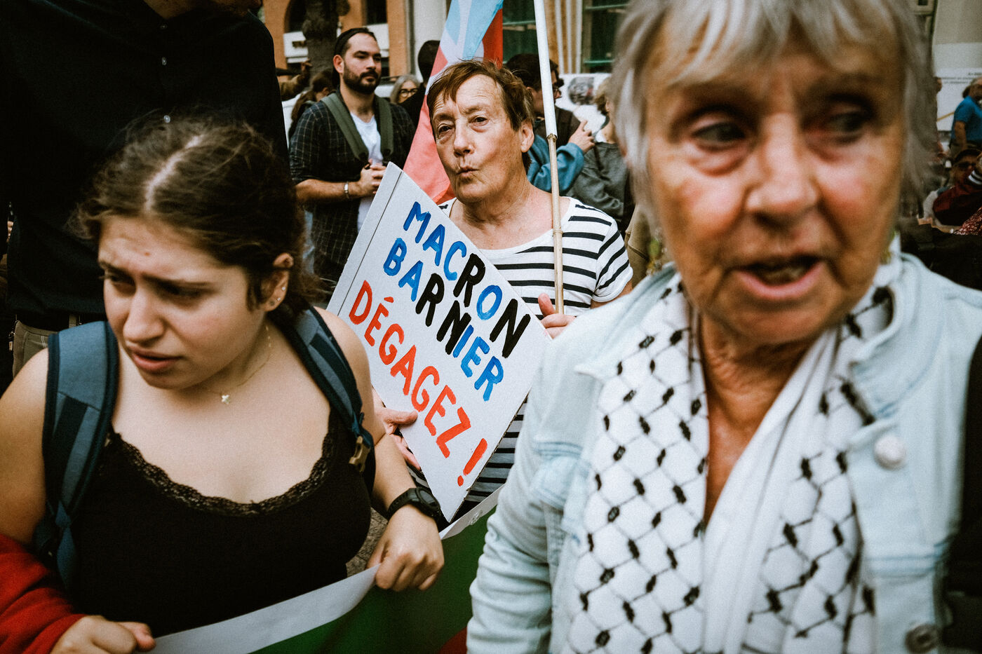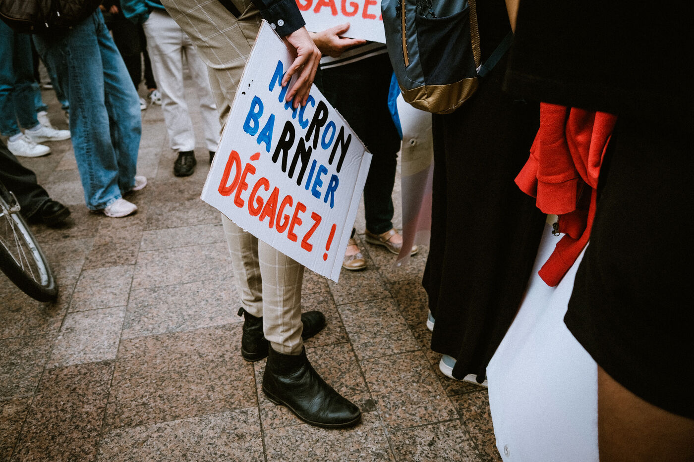 Marche contre le nouveau gouvernement Barnier, pour le respect du résultat du vote aux dernières élections législatives et la destitution du Président de la République à l'appel d'organisations de jeunesse et du parti de gauche La France Insoumise (LFI) à Toulouse, sud-ouest de la France, le 21 septembre 2024.