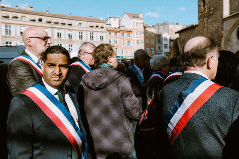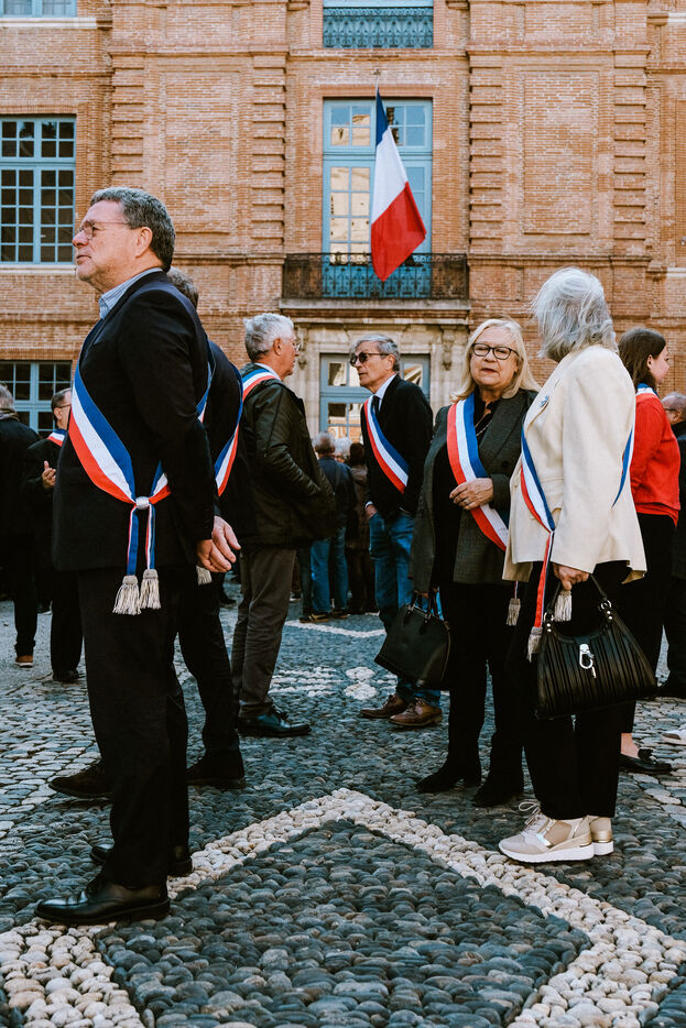 Demonstration of a hundred mayors in front of the prefecture against government budget cuts and loss of revenue for local authorities in Toulouse, southwest France on November 7, 2024.