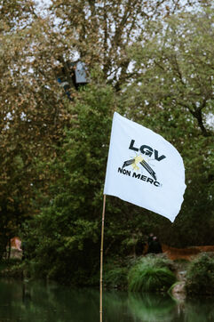 Opposition à la coupe d'arbres bordant le Canal Latéral à la Garonne et devant accueillir la future Ligne à Grande Vitesse ferroviaire (LGV) reliant Toulouse à Bordeaux à Saint-Jory, sud-ouest de la France le 9 novembre 2024.
