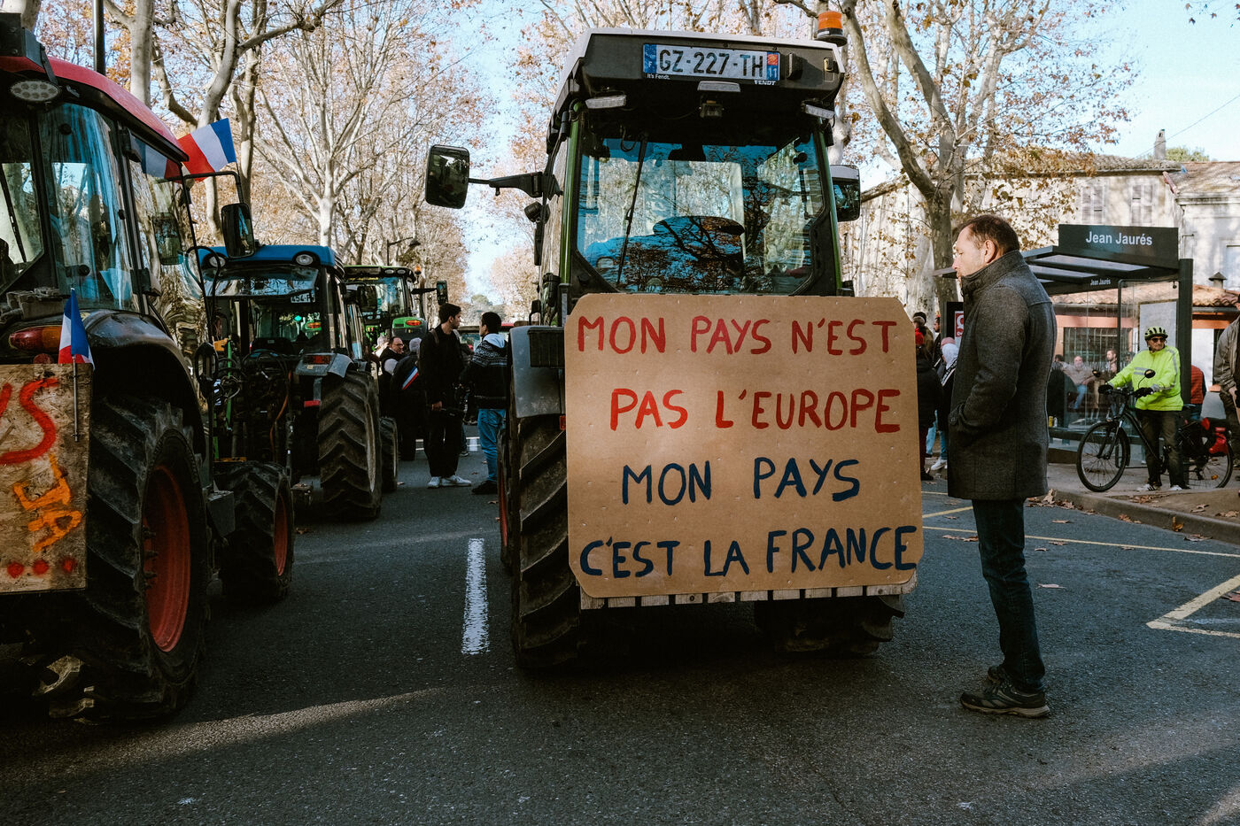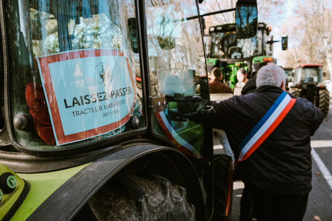 Demonstration organized by farmers and winegrowers from the FDSEA and Jeunes Agriculteurs unions concerned about the EU-Mercosur treaty and the weak progress on government promises from the beginning of the year in Carcassonne, southwest France on November 30, 2024.