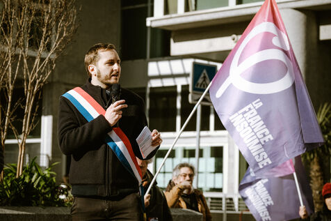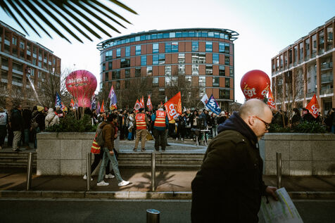 Rassemblement des agents des bibliothèques municipales en grève depuis le 5 décembre contre la suppression de postes et la baisse de budgets liées à la politique de redressement des comptes publics par la mairie à Toulouse, sud-ouest de la France le 4 février 2025.