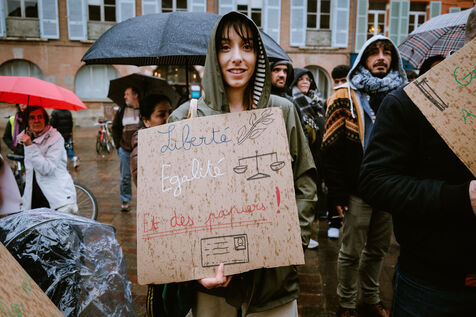 Rally called by CIMADE, the Human Rights League (LDH) and unions (FCPE, FSU, Solidaires, CGT) for the defense of undocumented children who are exiled or refugees but educated in the city's schools as well as the regularization of their families in Toulouse, southwest France on February 12, 2025.