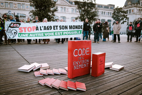 Rally against the construction site of the A69 Toulouse-Castres motorway at the time when the administrative court must examine the legality of environmental authorisations in Toulouse, south-west France on February 18, 2025.