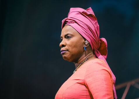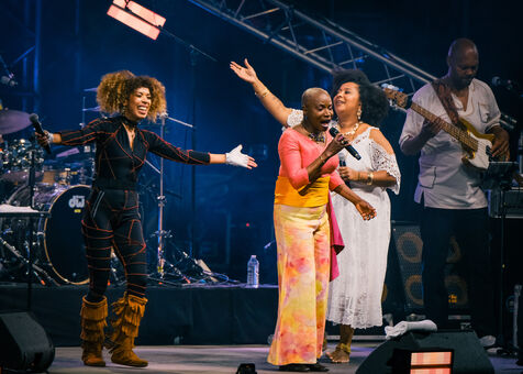 La diva béninoise accompagnée des brésiliennes Flavia Coelho, Karla Da Silva et Puma Camillê au festival Rio Loco célèbre depuis 30 ans les musiques du monde en bords de Garonne à Toulouse, sud-ouest de la France le 15 juin 2025.
