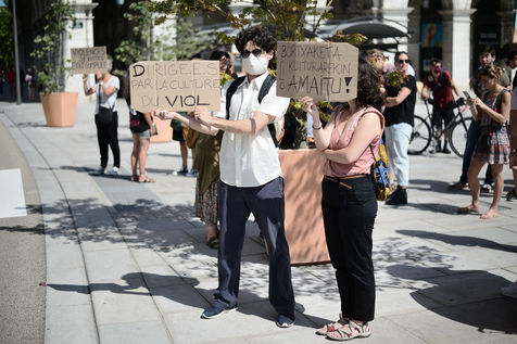 People protest in front of Bayonne town hall for the visit of Gerald Darmanin.