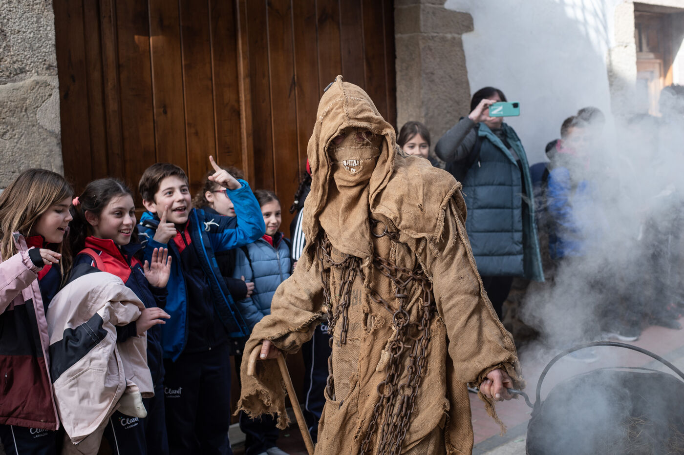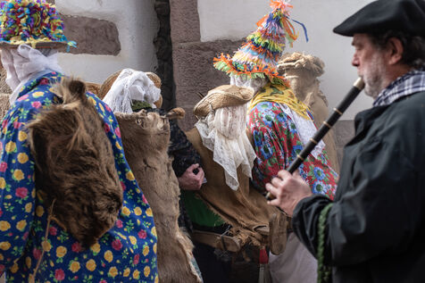 The carnival procession opens with the Perratzaileak, the farriers, who have to shoe Zaldiko, the horseman. Zaldiko emerges in the midst of the Txatxoak, masked and colourful creatures armed with broomsticks. The obese Ziripot is attacked by the Zaldiko, who knocks him over several times. Miel Otxin, a giant with arms in a cross, closes the procession. He is paraded through the streets of the village until his cremation on the evening of Mardi-Gras.
