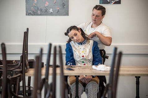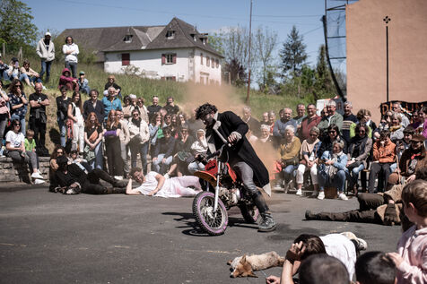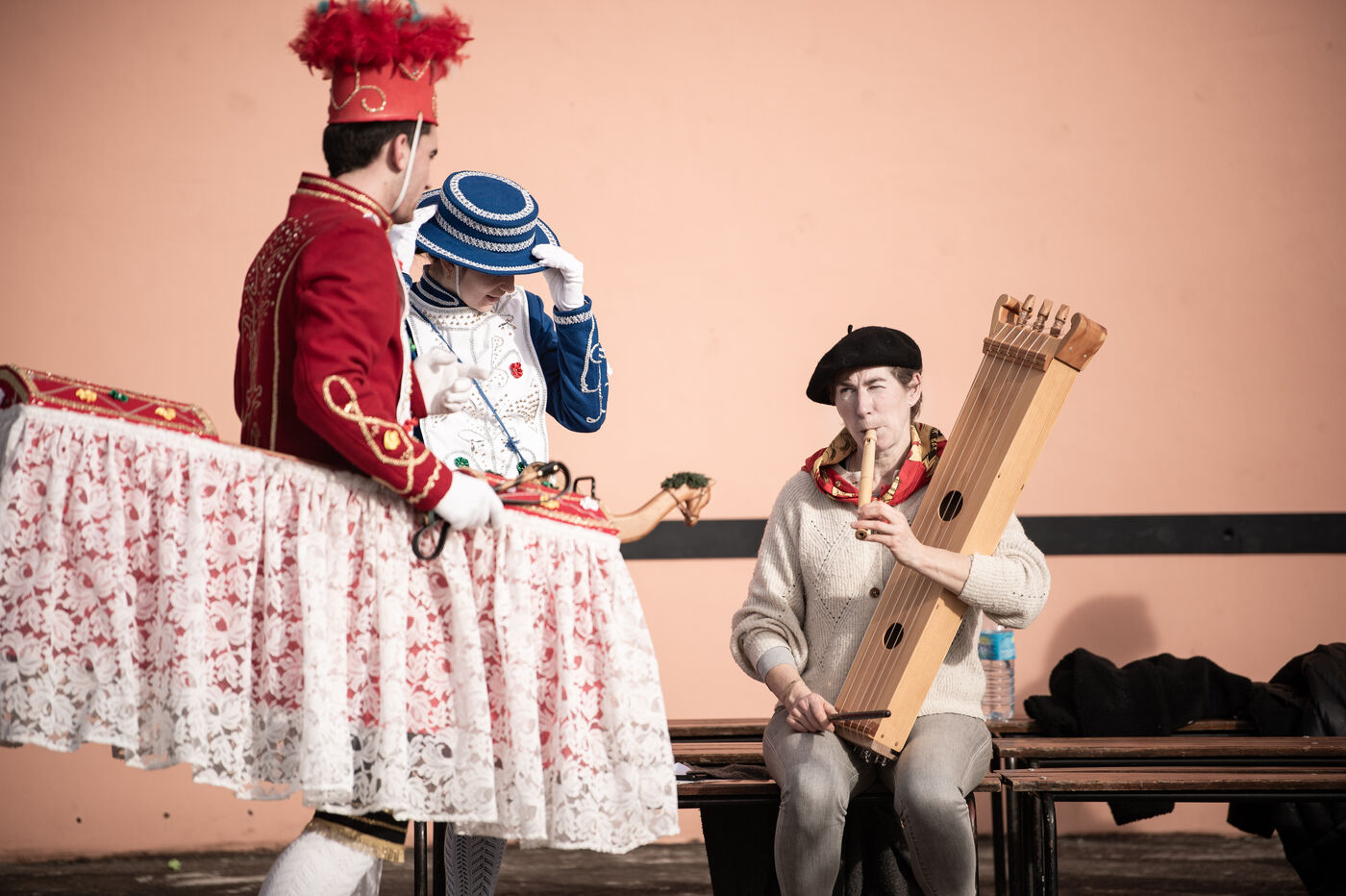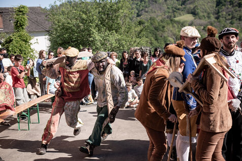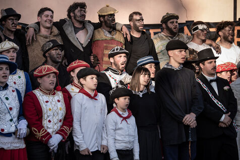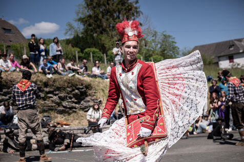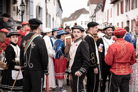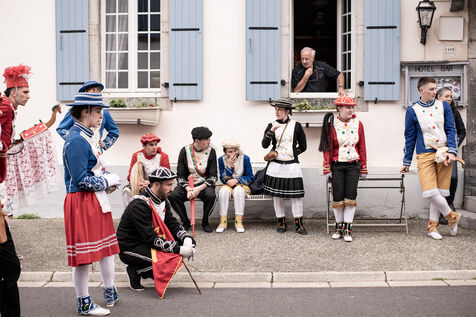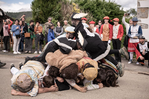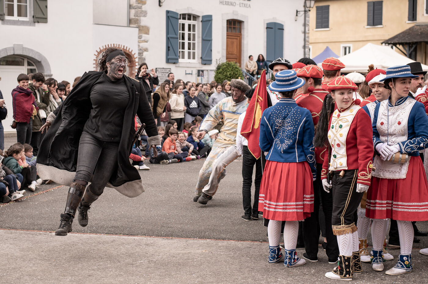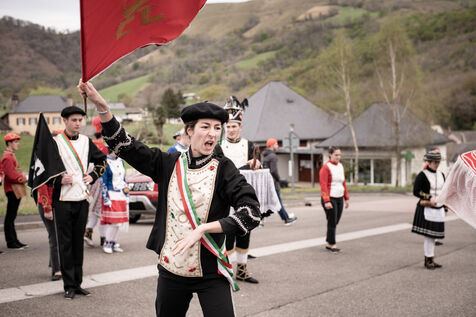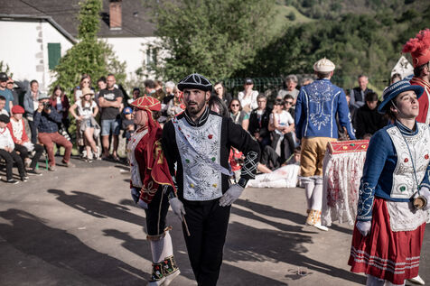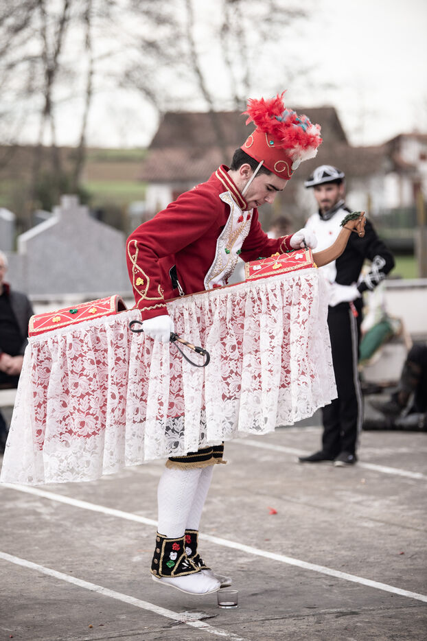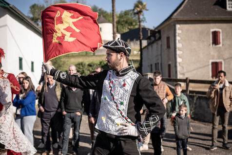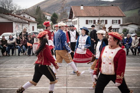 In the afternoon, usually on the fronton of the village, the Maskarada from Pagolle gives a popular theatrical performance combining dance, skits and song. The characters are divided into two groups. On the one hand, the "reds", elegant dancers, with the characters of Entseinari, Zamalzain, Gatuzain, Txerrero.... On the other, the « blacks » with the Buahame, Hartza and Kautere led by their chief Kabana and the facetious Pitxu.