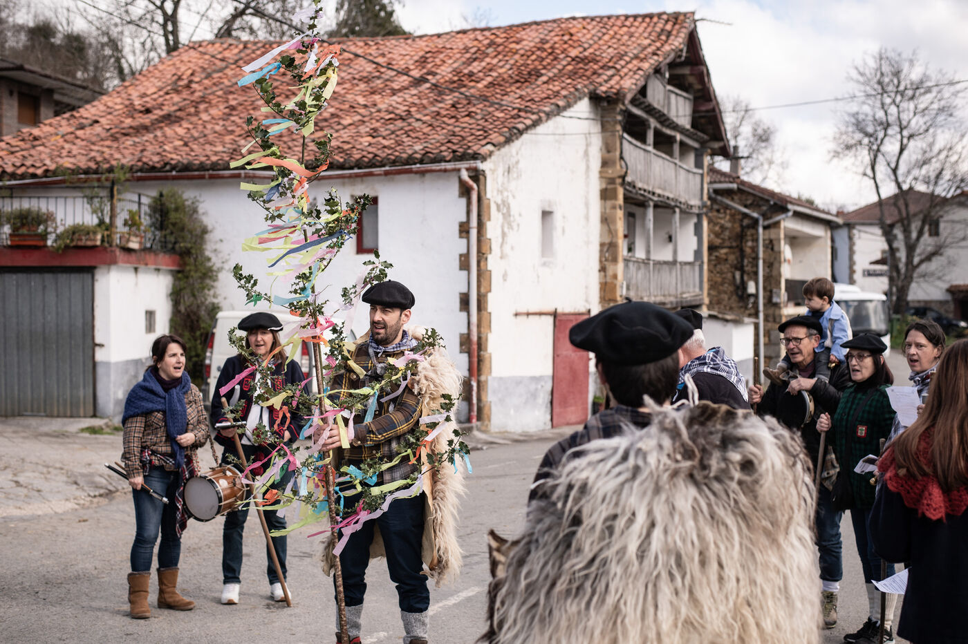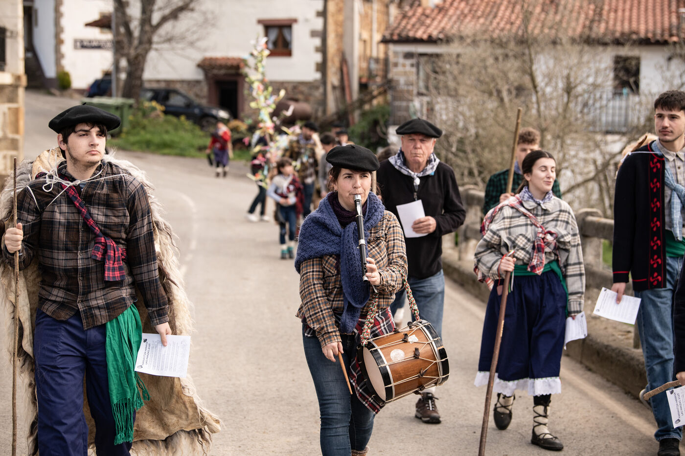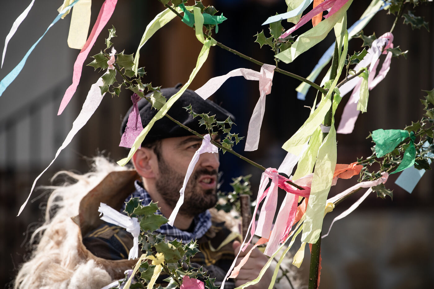 The group carries the spring tree wrapped in ribbons to announce the new year.