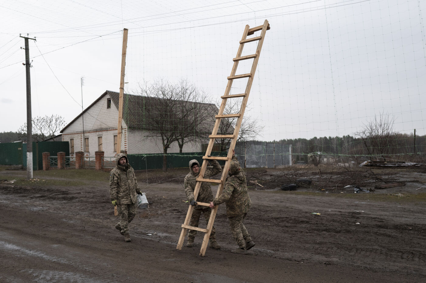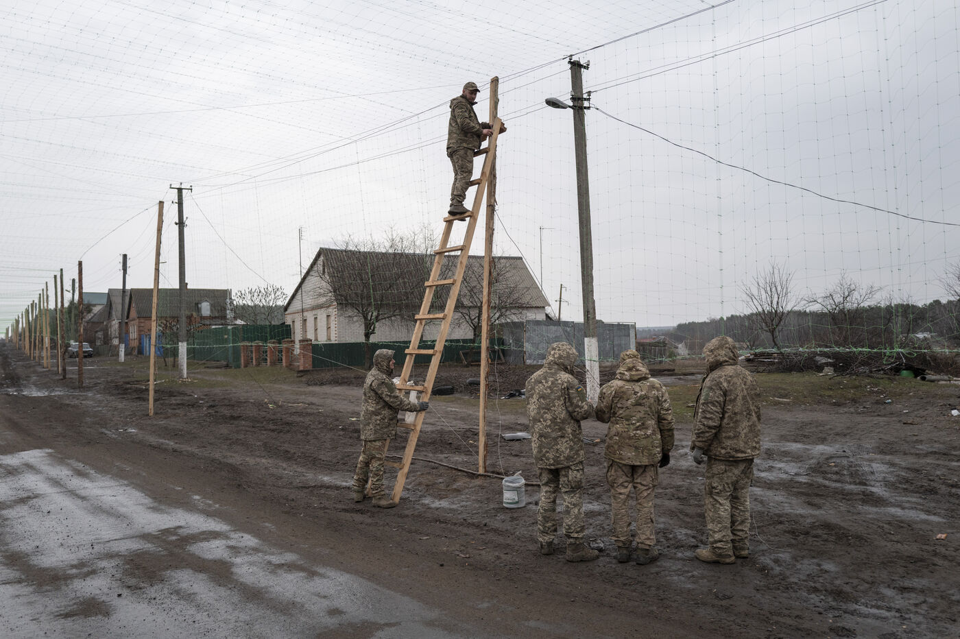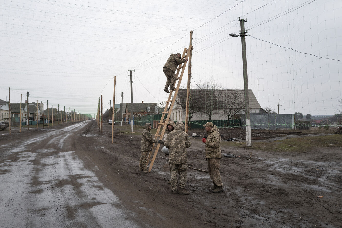 Soldiers from a Genie unit set up protective nets along a 10km stretch of road between the town of Sumy and the Russian border to protect civilian and military vehicles from Russian army suicide drones in the village of Pysarivka, Ukraine, on March 15, 2025.