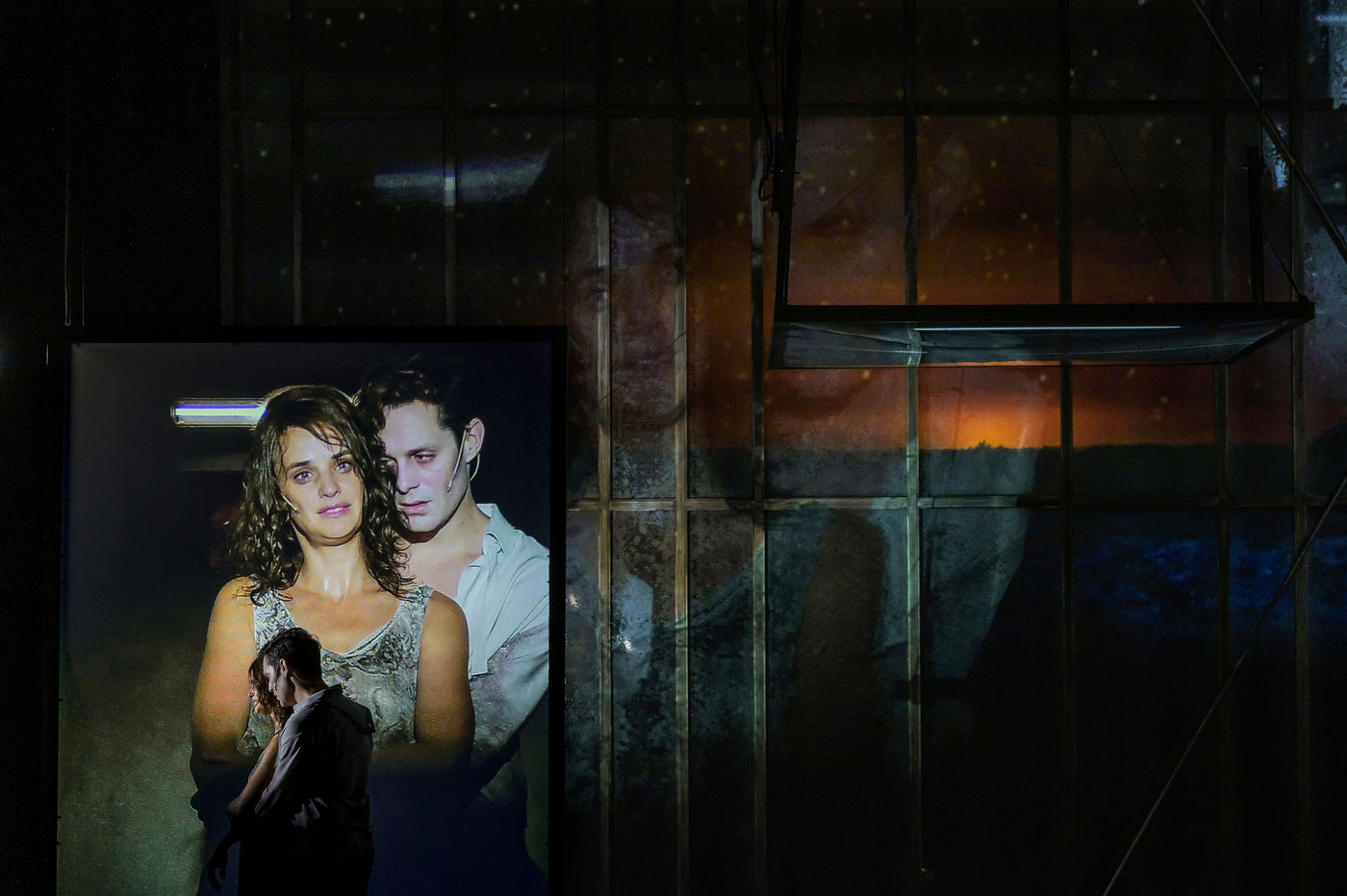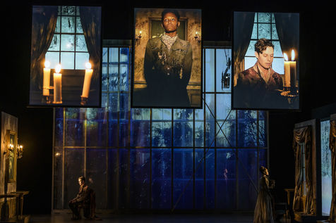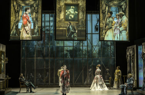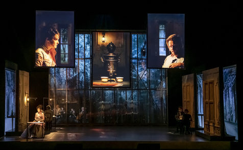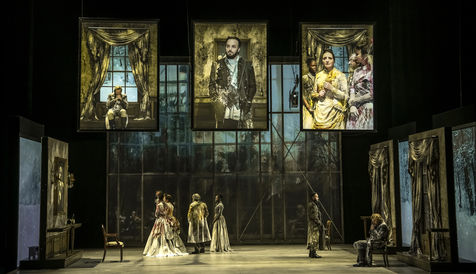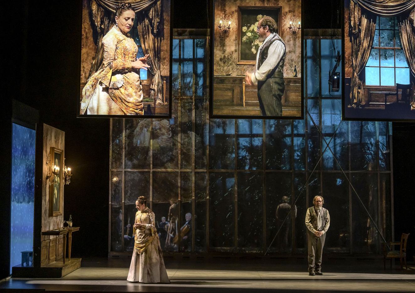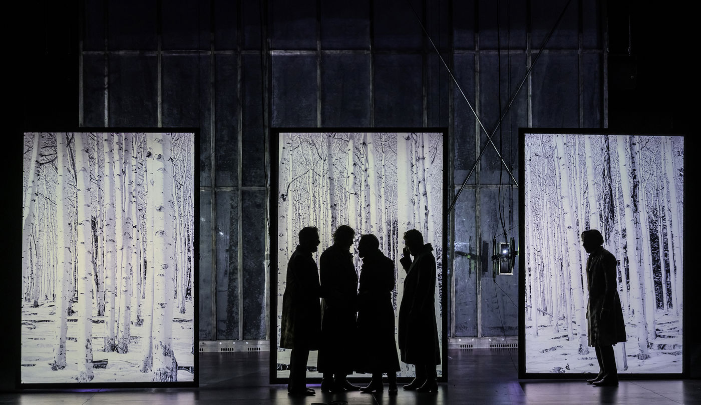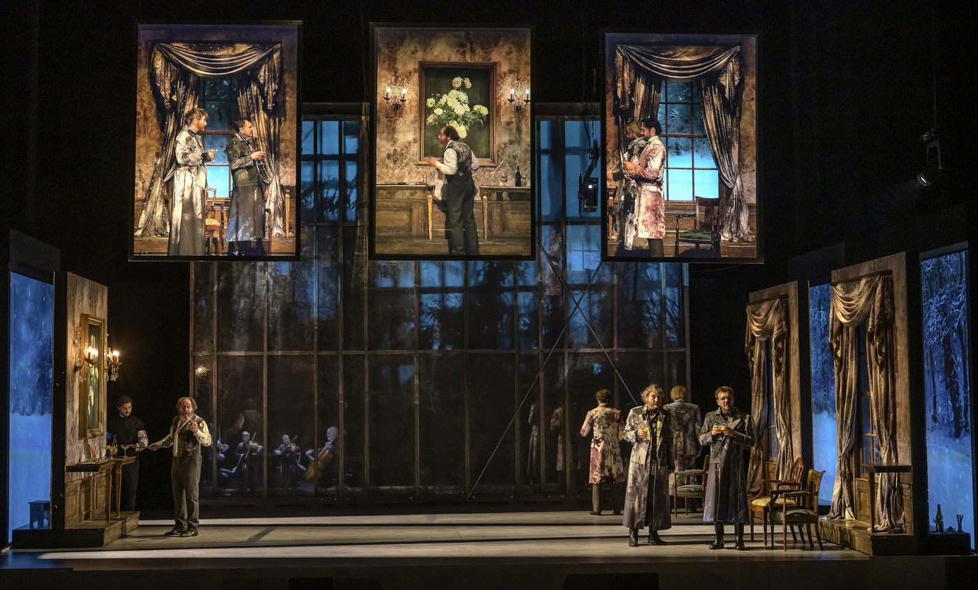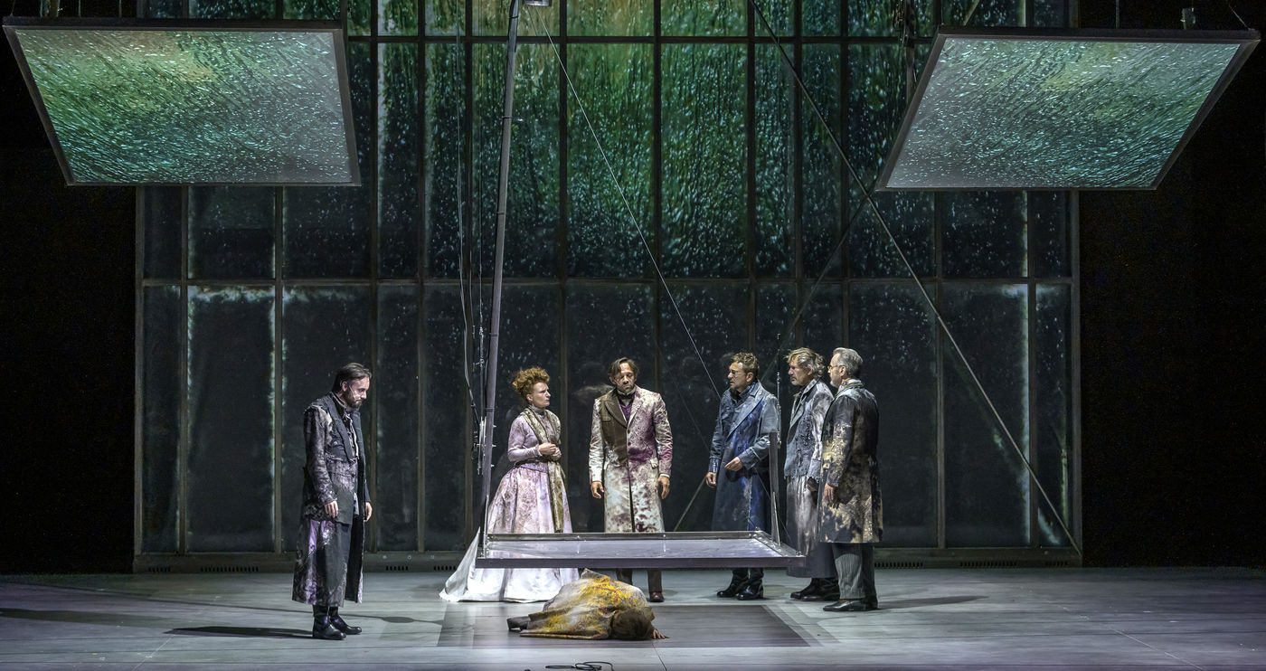 LES DEMONS d apres Fiodor Dostoievski, mise en scene Guy Cassiers avec Alexandre Pavloff (Chigaliov) Christian Gonon (Serguei Vassilitch Lipoutine) Julie Sicard (Arina Prokhorovna Virguinskaia) Serge Bagdassarian (Tolkatchenko) Herve Pierre (Stepane Trofimovitch Verkhovenski) Stephane Varupenne (Ivan Pavlovitch Chatov) Suliane Brahim (Maria Timofeievna Lebiadkina) Jeremy Lopez (Piotr Stepanovitch Verkhovenski) Christophe Montenez (Nikolai Vsevolodovitch Stavroguine) Dominique Blanc (Varvara Petrovna Stavroguina) Jennifer Decker (Liza) Clement Bresson (Virguinski) Claina Clavaron (Dacha)et les comediens de l academie Vianney Arcel, Robin Azema, Jeremy Berthoud, Heloise Cholley, Fanny Jouffroy, Emma Laristan a la Comedie Francaise salle Richelieu. Photographie de Pascal Gely / Hans Lucas