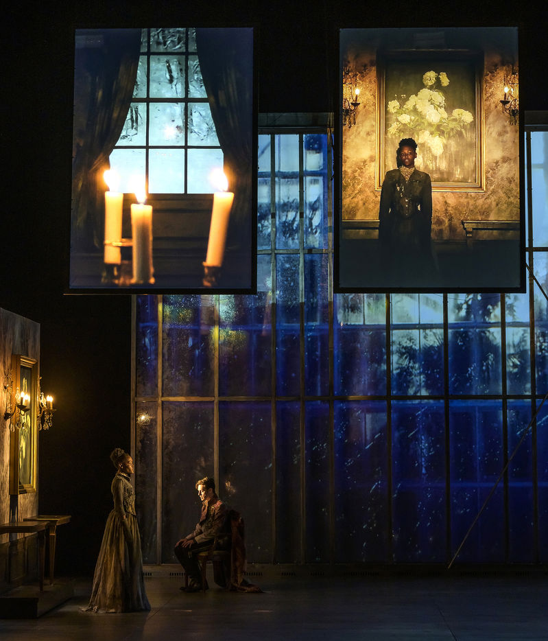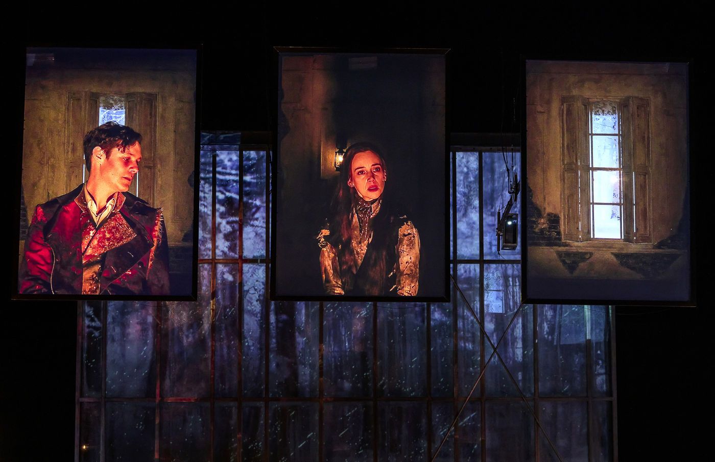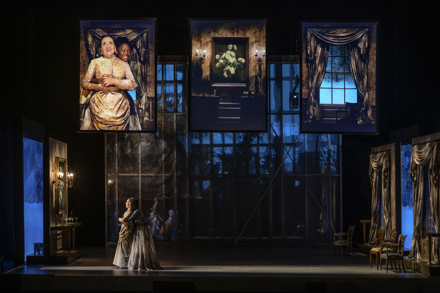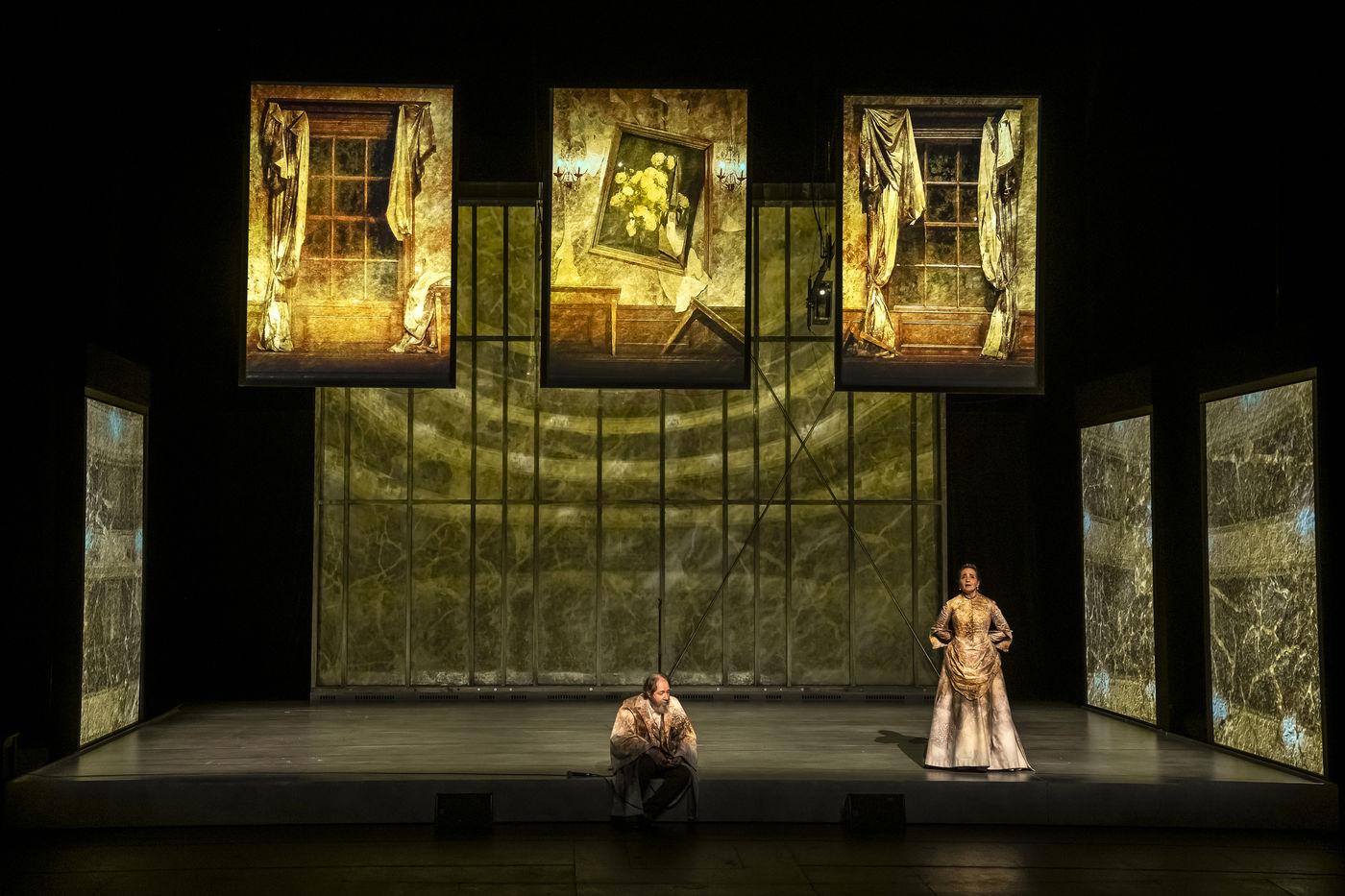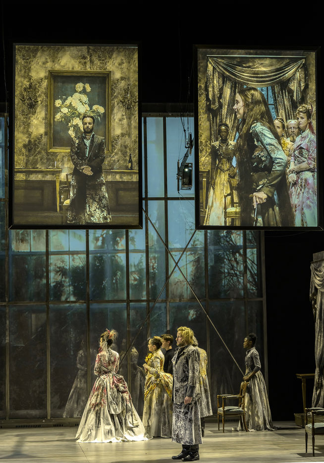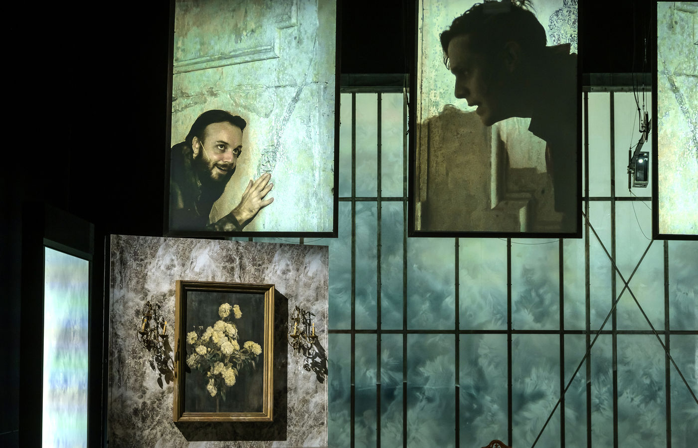 LES DEMONS d apres Fiodor Dostoievski, mise en scene Guy Cassiers avec Alexandre Pavloff (Chigaliov) Christian Gonon (Serguei Vassilitch Lipoutine) Julie Sicard (Arina Prokhorovna Virguinskaia) Serge Bagdassarian (Tolkatchenko) Herve Pierre (Stepane Trofimovitch Verkhovenski) Stephane Varupenne (Ivan Pavlovitch Chatov) Suliane Brahim (Maria Timofeievna Lebiadkina) Jeremy Lopez (Piotr Stepanovitch Verkhovenski) Christophe Montenez (Nikolai Vsevolodovitch Stavroguine) Dominique Blanc (Varvara Petrovna Stavroguina) Jennifer Decker (Liza) Clement Bresson (Virguinski) Claina Clavaron (Dacha)et les comediens de l academie Vianney Arcel, Robin Azema, Jeremy Berthoud, Heloise Cholley, Fanny Jouffroy, Emma Laristan a la Comedie Francaise salle Richelieu. Photographie de Pascal Gely / Hans Lucas