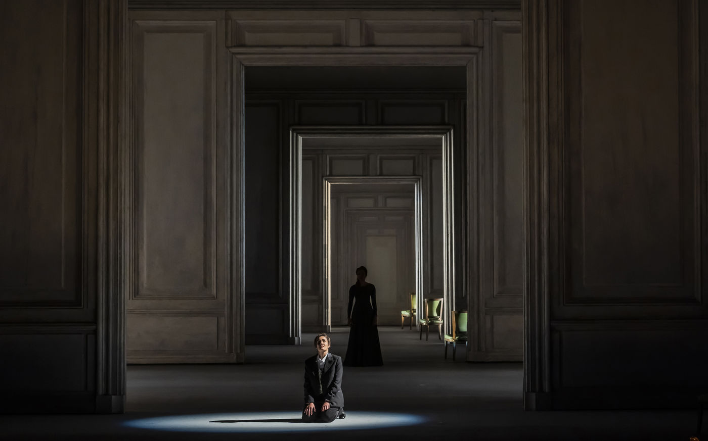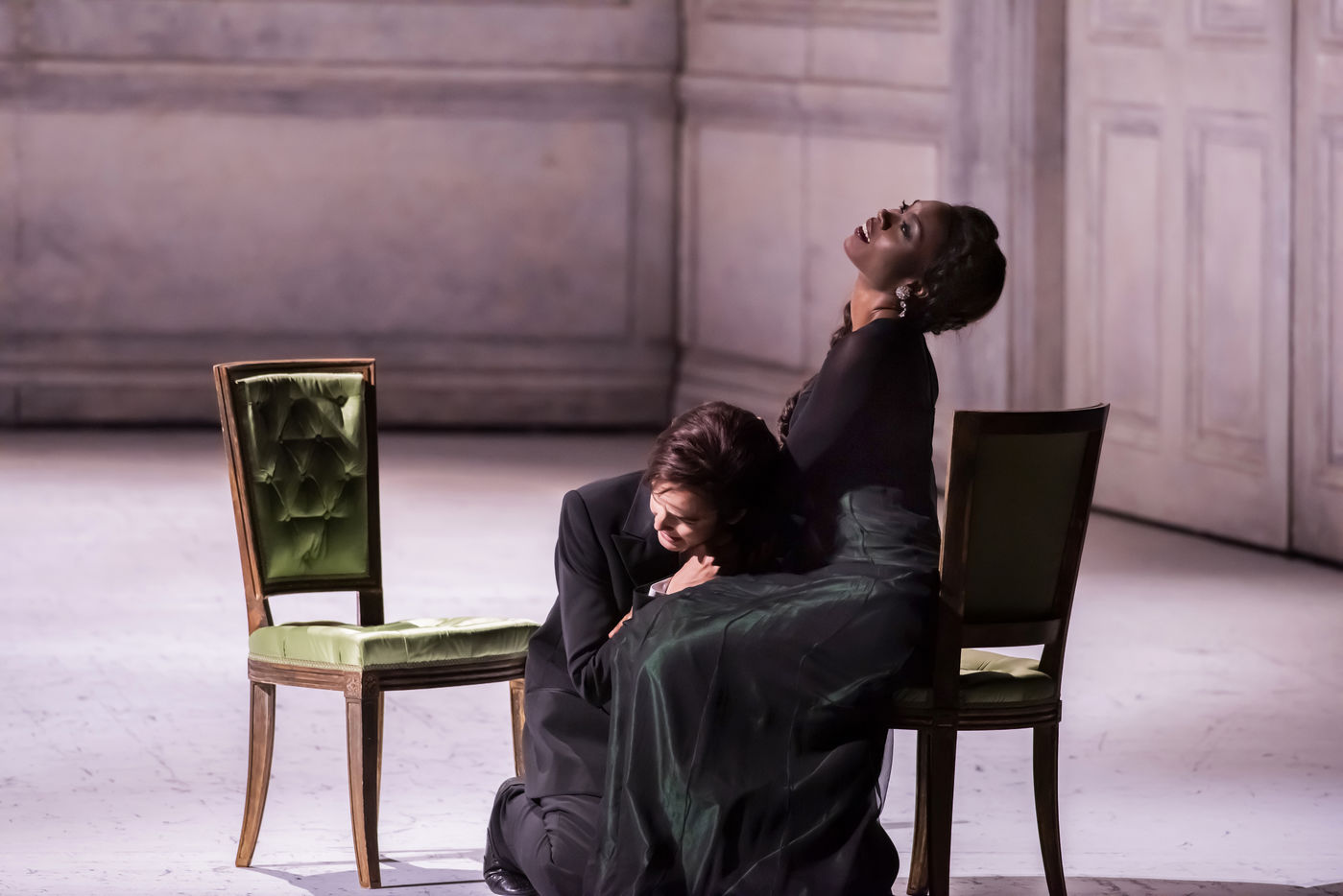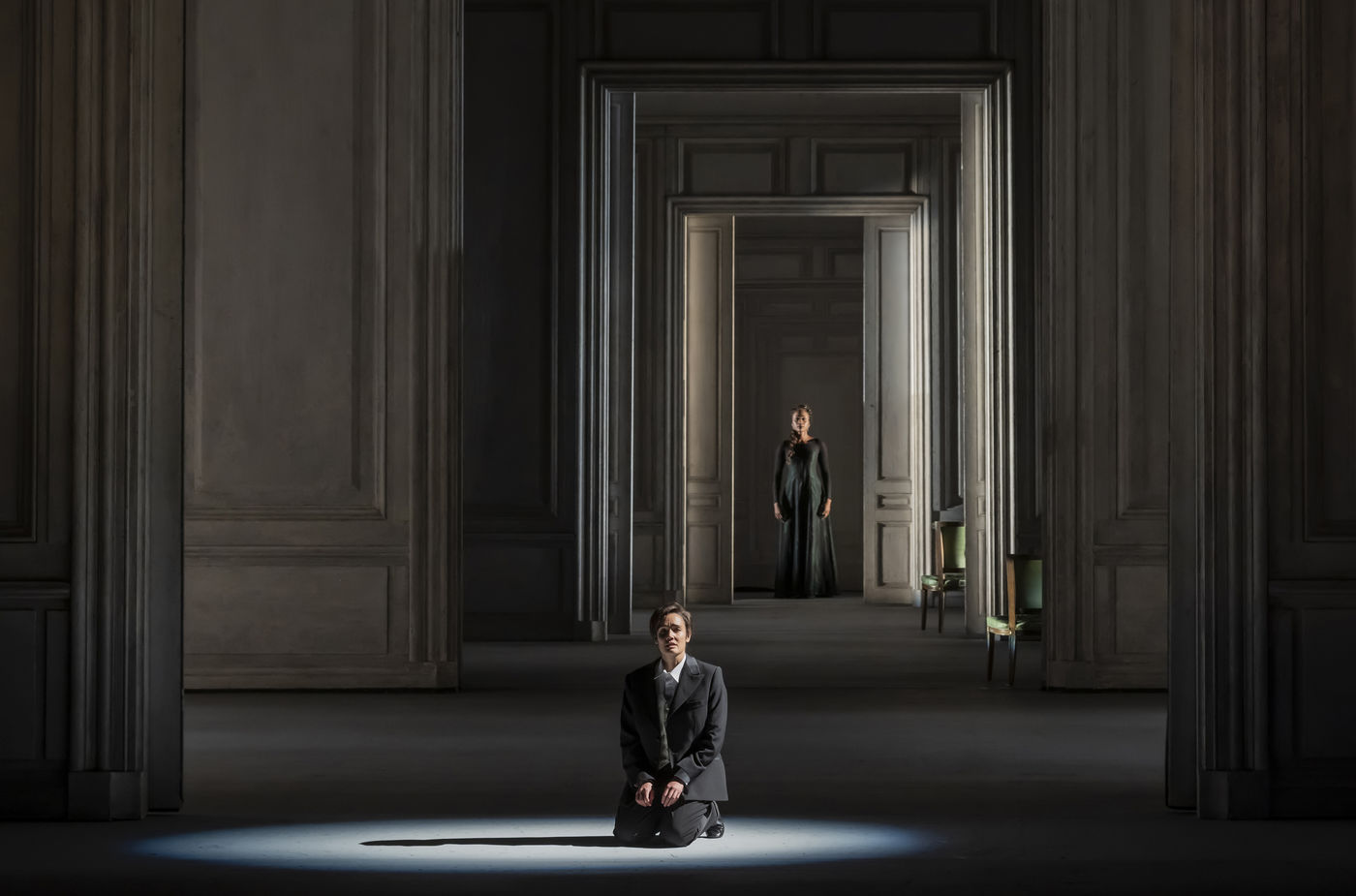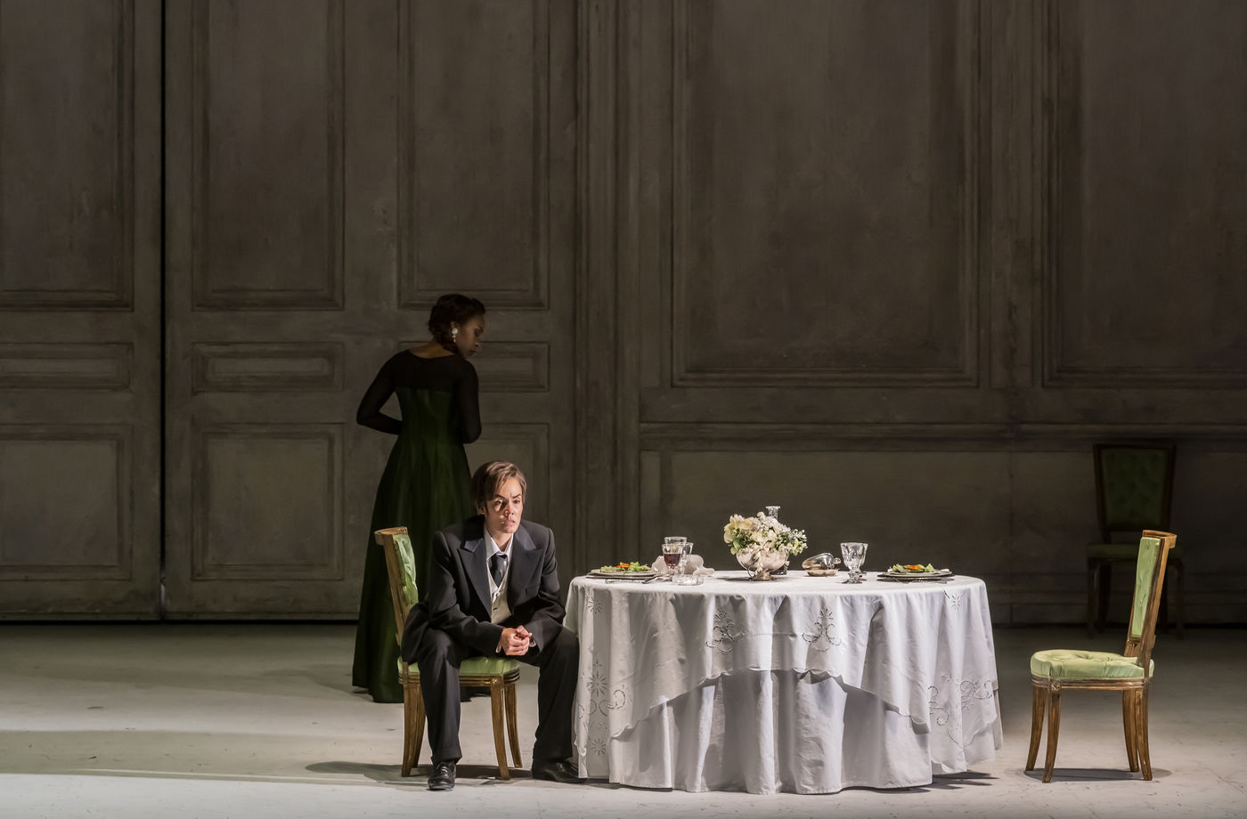 ALCINA musique Georg Freidrich Haendel direction musicale Thomas Hengelbrock mise en scene Robert Carsen avec Jeanine De Bique : Alcina, Gaelle Arquez : Ruggiero, Sabine Devieilhe : Morgana, Roxana Constantinescu : Bradamante, Rupert Charlesworth : Oronte et Nicolas Courjal : Melisso : Melisso a l Opera National de Paris Palais Garnier. Photographie de Pascal Gely / Hans Lucas