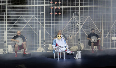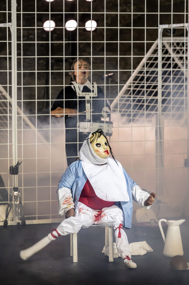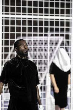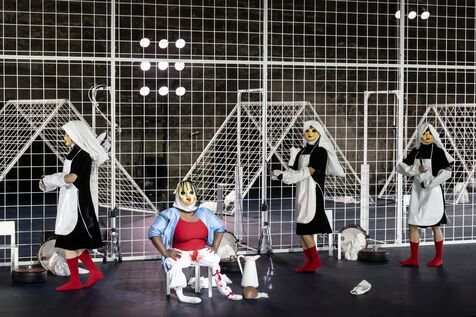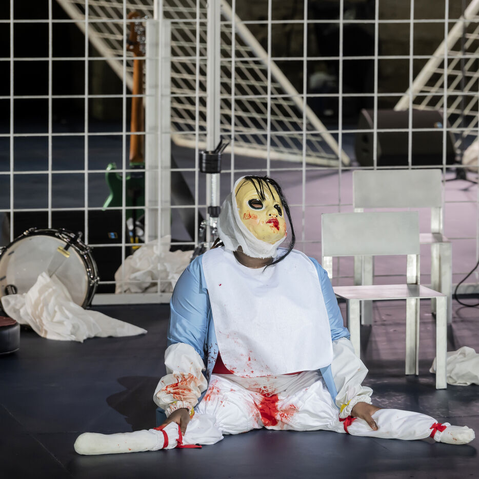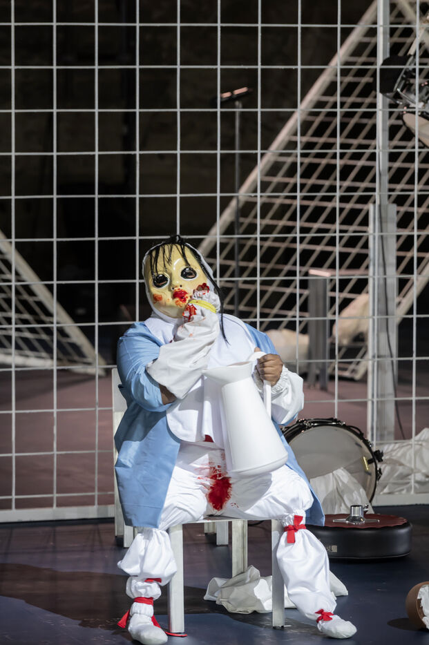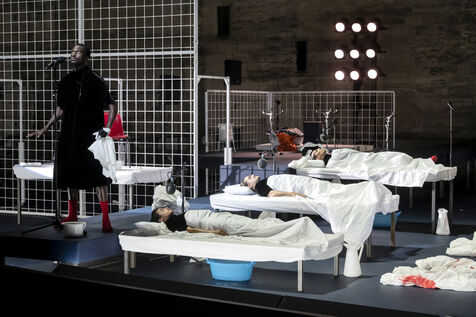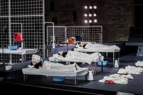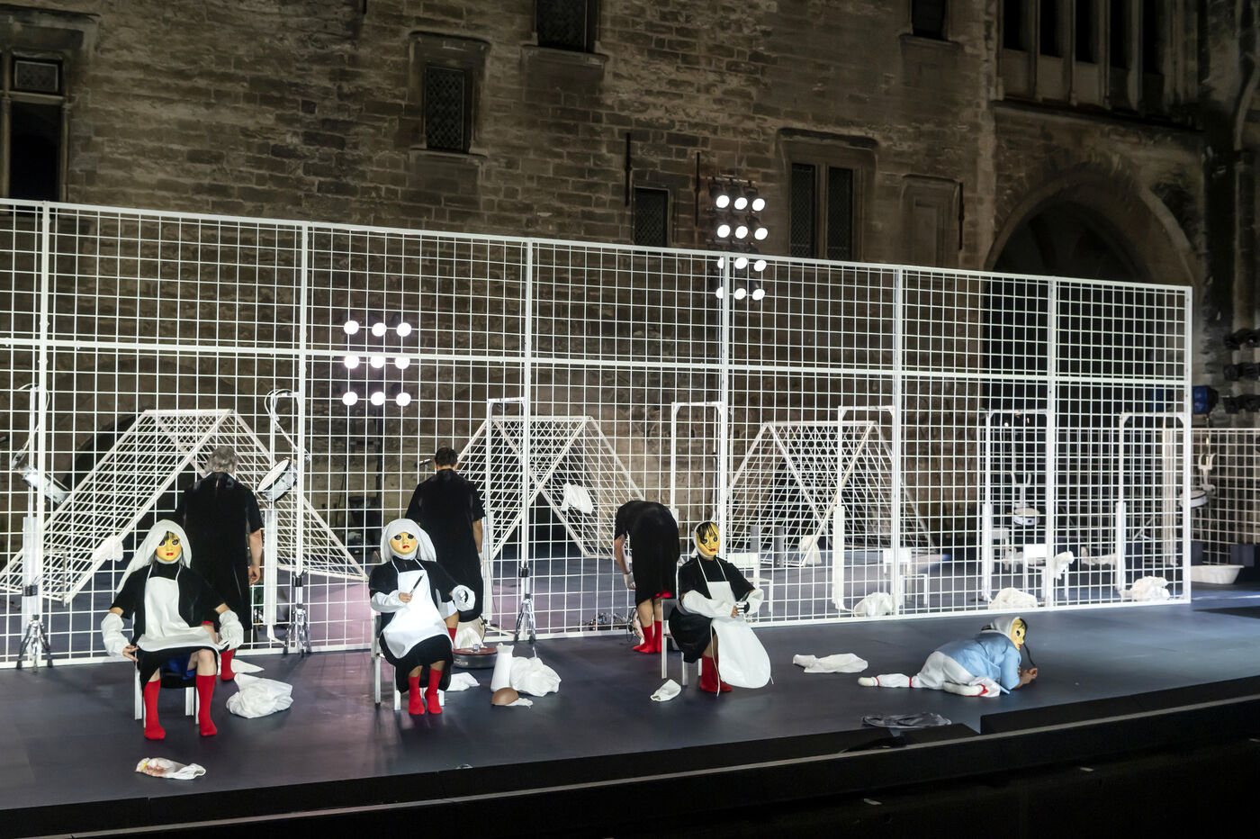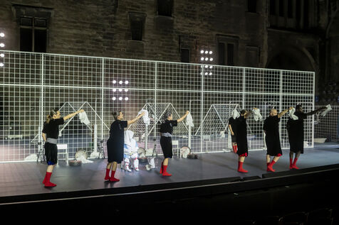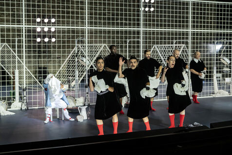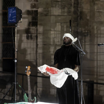NOT Choreography by Marlene Monteiro Freitas with Marie Albert, Joaozinho da Costa, Miguel Filipe, Ben Green, Henri « Cookie » Lesguillier, Tomas Boital, Rui Paixao and Marian Freitas at the Cour d Honneur du Palais des Papes Avignon. Photograph by Pascal Gely / Hans Lucas