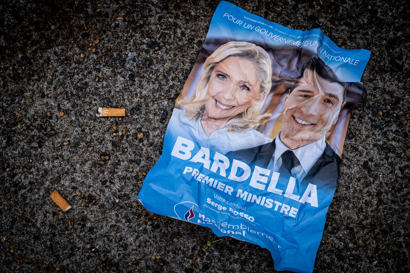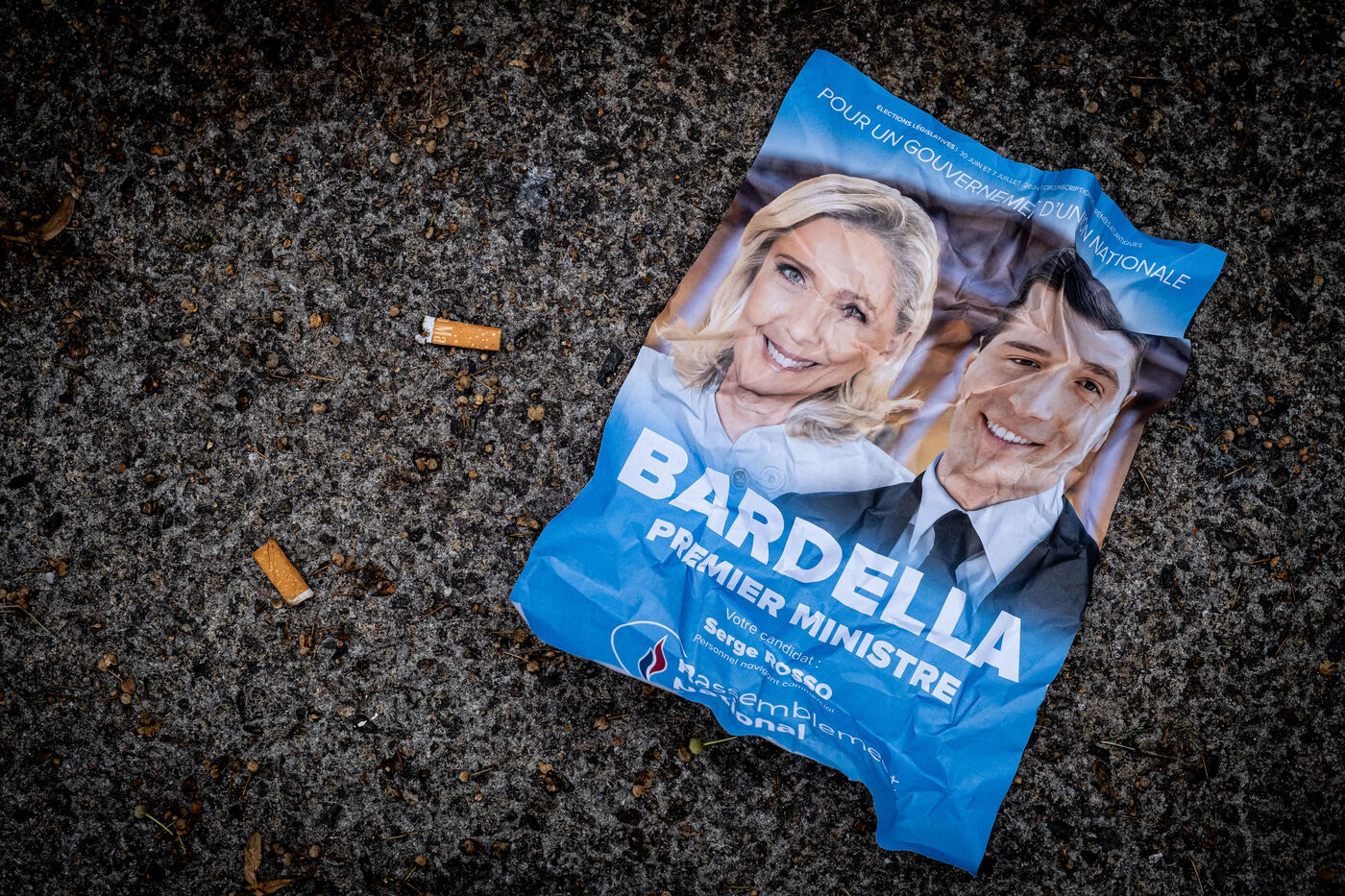 Rassemblement National candidate's, Jordan Bardella, crumpled electoral leaflet.
