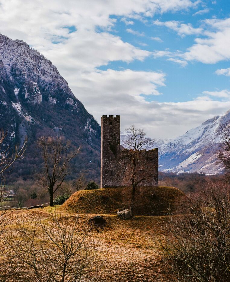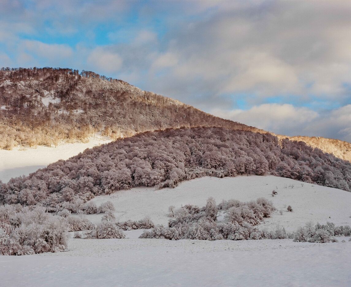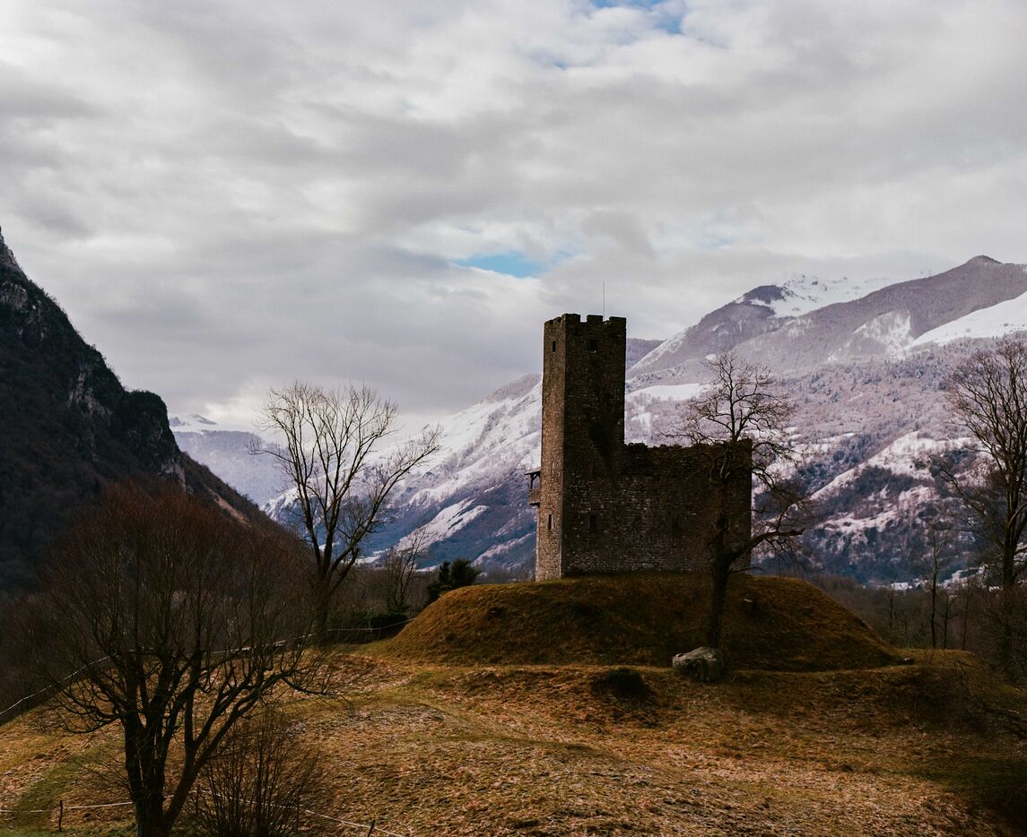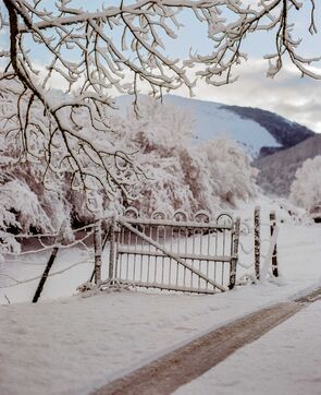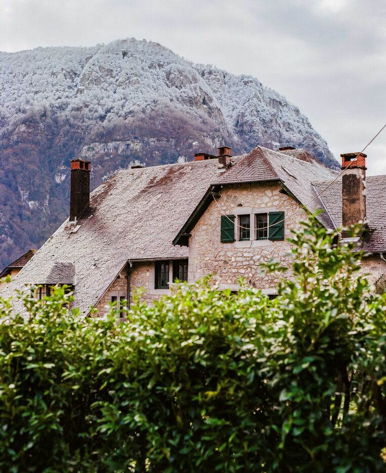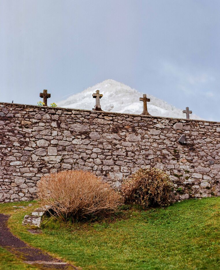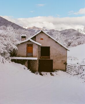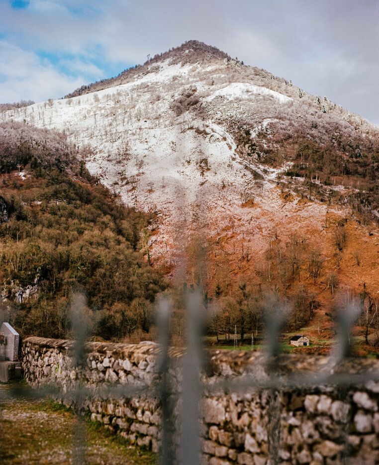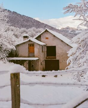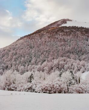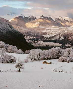 Le village Pyréneen de Castet, sur fond vertical et enneigé, le col de Port de Castet qui le surplombe, plateau de pâturages et de forêts offre un paysage qui allie grands espaces pastoraux et zones forestières face au Plateau du Bénou, sur le versant ouest de la Vallée d’Ossau.