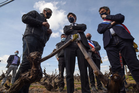 Visite du ministre de l'agriculture Julien Denormandie en touraine pour la lutte contre le gel et les aides de l'etat.