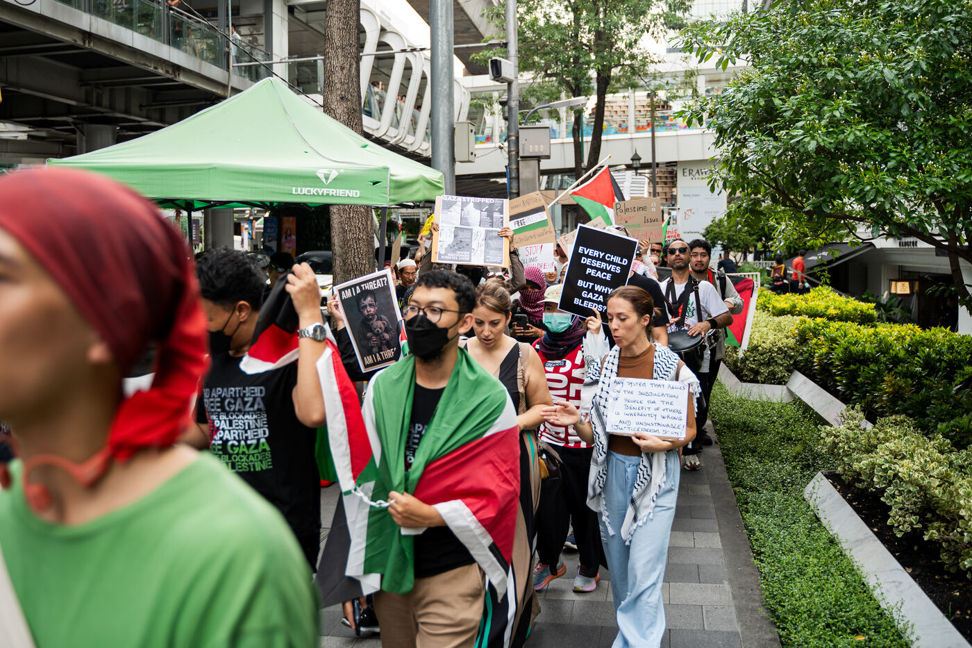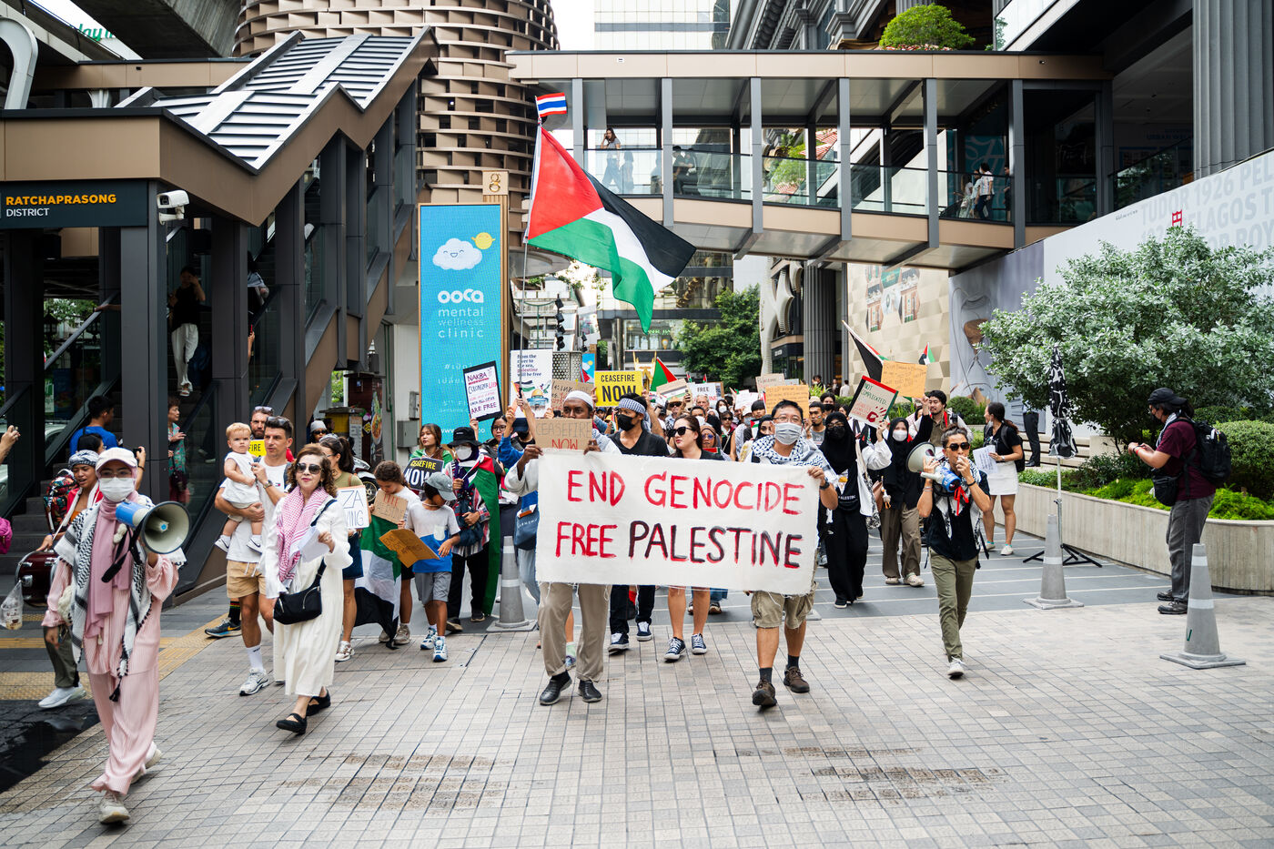 Le 15 juin 2025, une marche de solidarité s’est déroulée à Bangkok, en Thaïlande, organisée par le Palestine Solidarity Campaign (PSC). Les manifestants se sont réunis à la station BTS Chidlom avant de se diriger vers le MBK Center. La marche s’inscrivait dans un mouvement mondial de soutien à la "Global March to Gaza", arrivée le même jour à la frontière de Rafah. Les manifestants brandissaient des pancartes et scandaient des slogans appelant à la fin du génocide, de l’apartheid et de l’occupation en Palestine. Ils ont exigé un cessez-le-feu immédiat et l’entrée de l’aide humanitaire à Gaza. La manifestation pacifique visait à exprimer la solidarité internationale avec le peuple palestinien et à relayer les appels mondiaux à la justice et à l’action humanitaire.