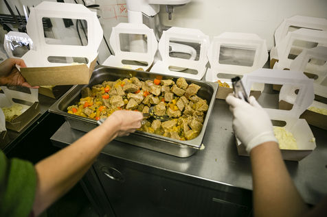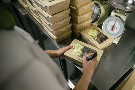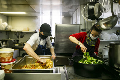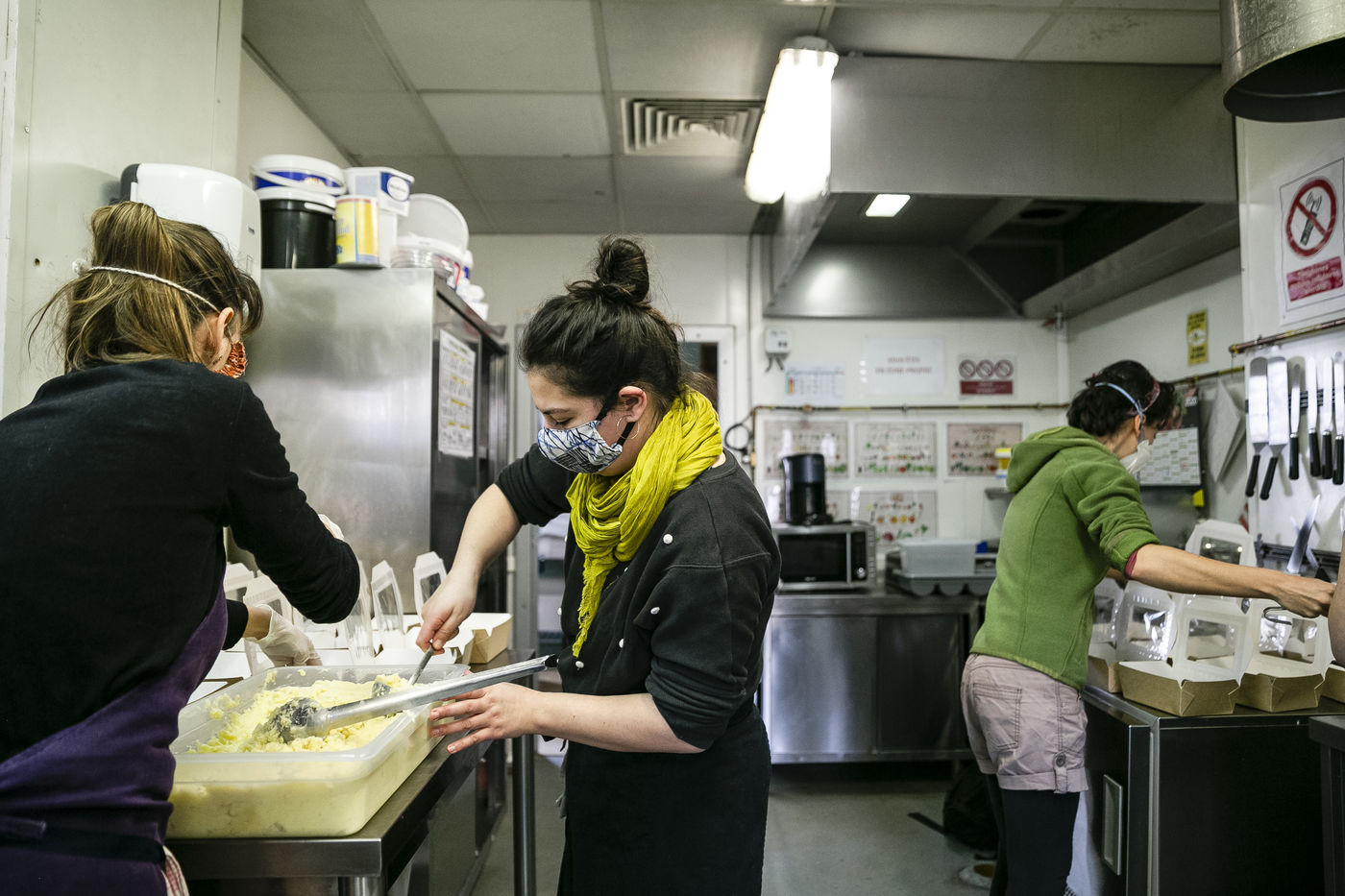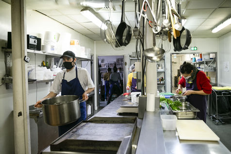 L'équipe du restaurant, majoritairement féminin, est compose par des chefs de l'association Yes We Camp et des apprentis en insertion qui seront aidés par des bénévoles pour assurer le rythme de travail impose par cette nouvelle mission une fois le restaurant a dû fermer à cause de l'épidémie. Les plats proposes varient selon les produits récupérés et amenés au centre pour éviter le gaspillage alimentaire. Par exemple le jour du reportage, les repas cuisines étaient composes par des cuisses de poulet, canard émincé, saumon fume, guacamole, mozzarella fraiche et pates bio entre autres. Les repas sont distribués en direct dans la cour centrale des Grands Voisins en collaboration avec l'association Aurore mais aussi distribues tout autour Paris par une myriade d'associations et bénévoles qui viennent récupérer et préparer les sacs repas et partent en vélo (c'est le cas pour Ovo, une coopérative de logistique a vélo), camion ou voiture. Avant le confinement, ce restaurant élaborait une cuisine de haute qualité privilégient les circuits courts pour son approvisionnement, tout en proposant d'autres manières de consommer, comme les cafés et repas suspendus, afin de permettre un accès aux produits vendus pour tous les publics.
