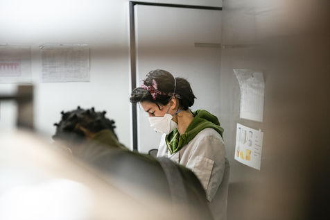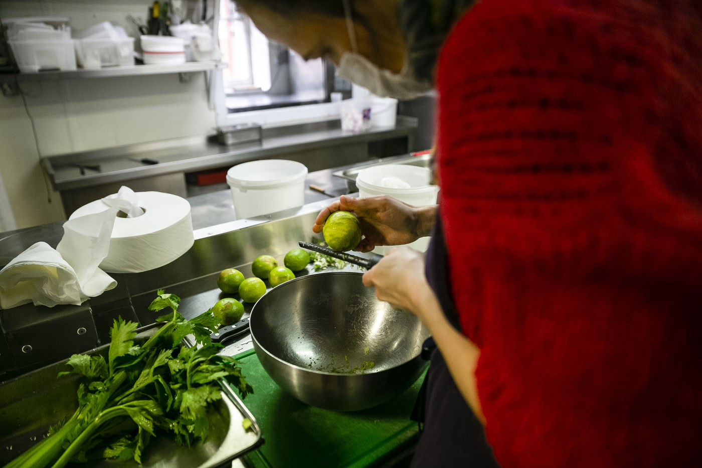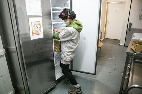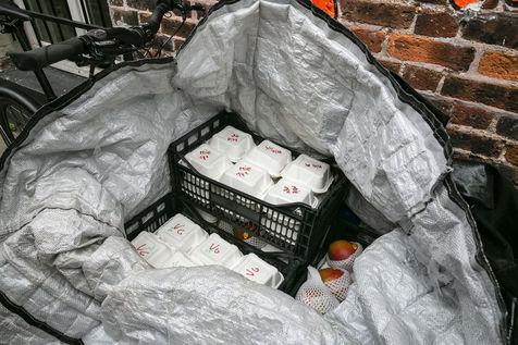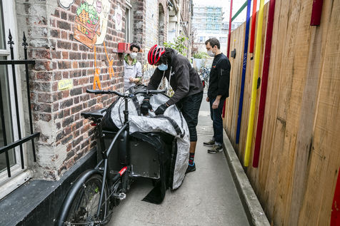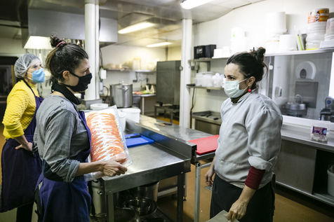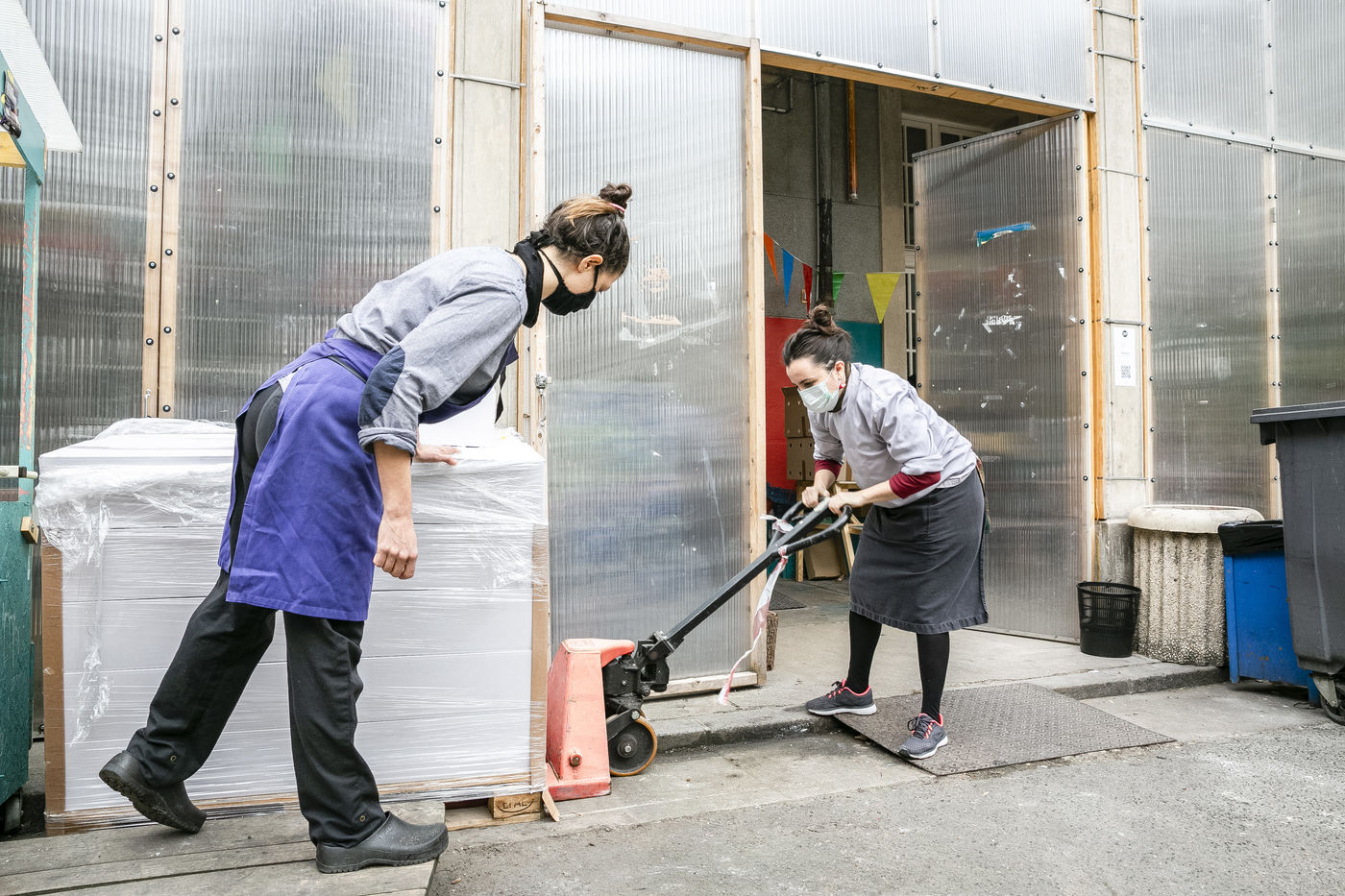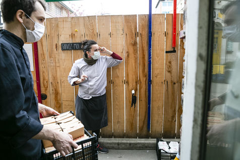 The restaurant team, mostly female, is made up of chefs from Yes We Camp association and apprentices who will be assisted by volunteers to ensure the pace of work imposed by this new mission once the restaurant has had to close down because of the epidemic. The dishes offered vary according to the products collected and brought to the centre to avoid food waste. For example, on the day of the report, the meals were made up of chicken, sliced duck, smoked salmon, guacamole, fresh mozzarella and organic pasta among others. The meals are distributed directly in the central courtyard at Grands Voisins centre in collaboration with the association Aurore but also distributed all around Paris by a myriad of associations and volunteers who come to collect and prepare the lunch bags and leave by bike (that is the case for Olvo a logistics-on-bike co-op), truck or car. Before the confinement, this restaurant proposed a high quality cuisine, privileging short circuits for its supply, while offering other ways of consumption, such as pre-paid-by-someone-else coffees and meals, to allow access to the products sold for all audiences.