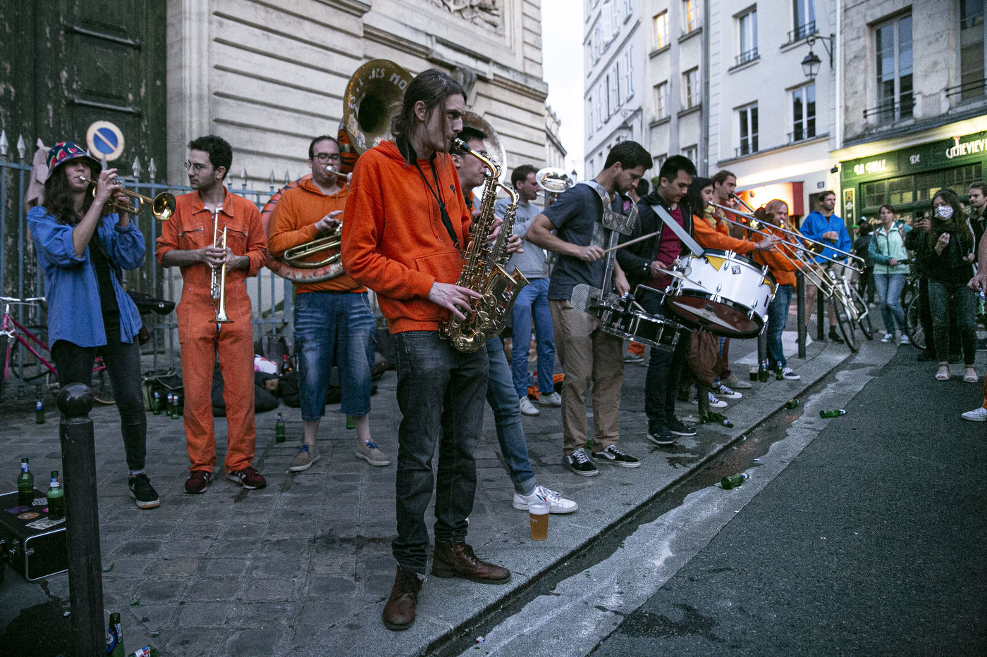 Suite aux conditions de de-confinement et à l'appel du gouvernement à respecter les nouvelles normes sanitaires en vigueur et à ne pas créer de rassemblements physiques non autorisés, il y a eu moins de concerts et de personnes dans les rues. Telle était l'ambiance à la rue Mouffetard dans le 5e arrondissement de la capitale. Paris 21/ 06/ 2020. Photographie de Pablo Porlan / Hans Lucas.