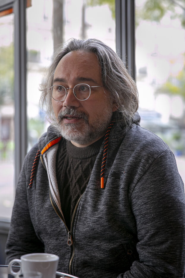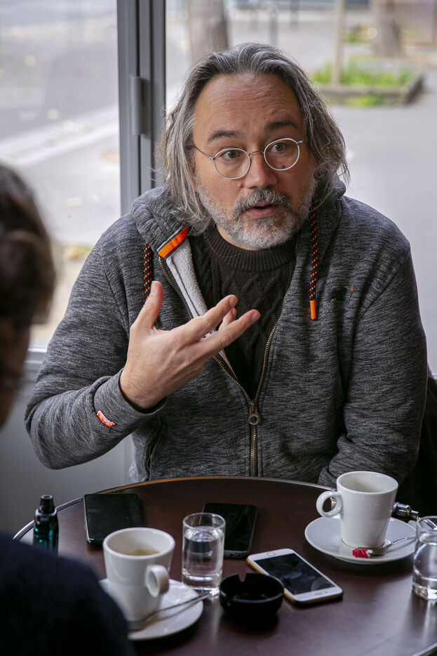 Paris, 2022-11-26 Hubert Guillaud, journalist and editorialist specialising in technical and digital systems, was the editor-in-chief of InternetActu.net. His last book was published in October 2022 under the title "Coinces dans Zoom. A qui profite le télétravail?". Photographs by Pablo Porlan/ Hans Lucas.