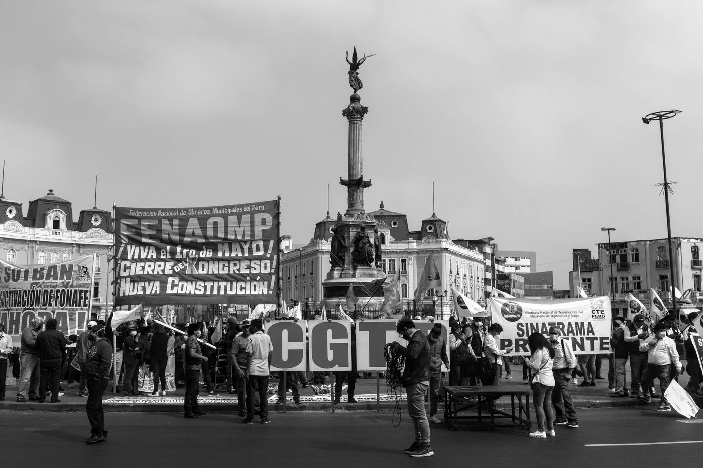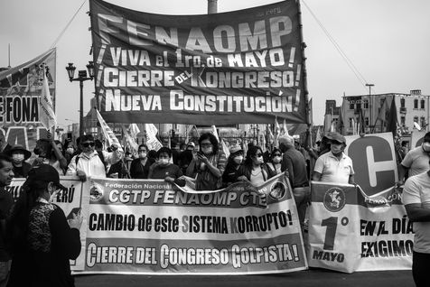The demonstration of May 1st in Lima was held at the initiative of the CGTP (Confederación General de Trabajadores del Perú). People gathered in the Dos de Mayo square, in front of the CGTP headquarters, from the balcony of which Pedro Castillo, president of the Peruvian Republic, spoke, to the statue of José Carlos Mariátegui, in the 28 de Julio Avenue in the center of Lima. The demands are about the right of work, but also about the call to a constituent assembly, one of the campaign promises of Pedro Castillo. This last one accuses the current constitution which erects the economic liberalism in principle to be responsible for the economic inequalities in Peru.