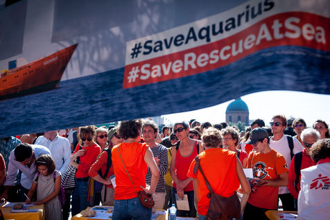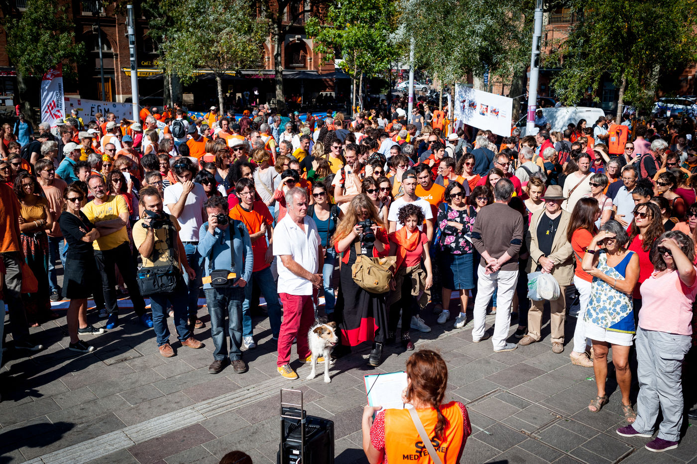 Samedi 6 2018octobre, place Saint Pierre à Toulouse, plus d'un millier de personnes ont répondu à l'appel de SOS Méditérranée, en soutien à leur navire l'Aquarius, bloqué à quai à Marseille depuis le 4 octobre. Beaucoup portaient du orange, en rappel à la coque du bateau.