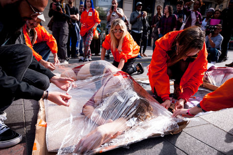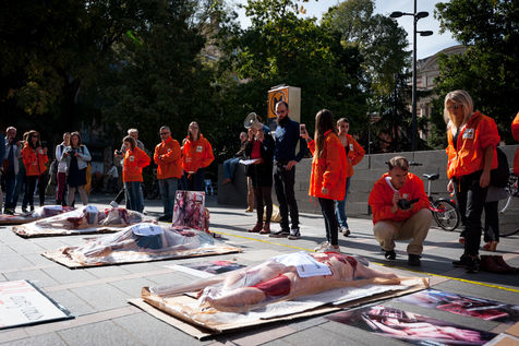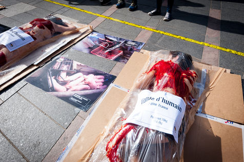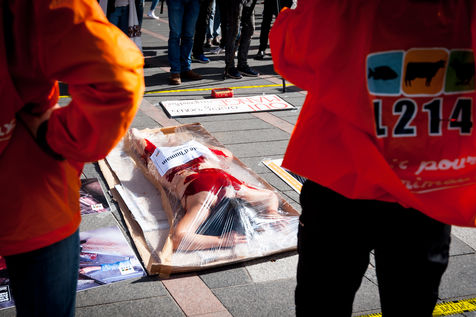A call from the movement for animal cause L214 organised on Wednesday 16 October a "barquette action" in Toulouse, in which the activists lay down in trays and play dead covered in fake blood in order to raise awareness about meat consumption.
