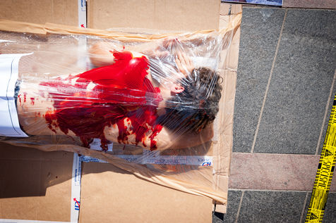 Un appel du Mouvement pour la cause animale L214 a organise ce mercredi 16 octobre une "action barquettes" square Charles de Gaulle à Toulouse, lors de laquelle les militants s'étaient allonges dans des barquettes et faisaient les morts recouverts de faux sang afin d'interpeller l'opinion sur la consommation de viande.