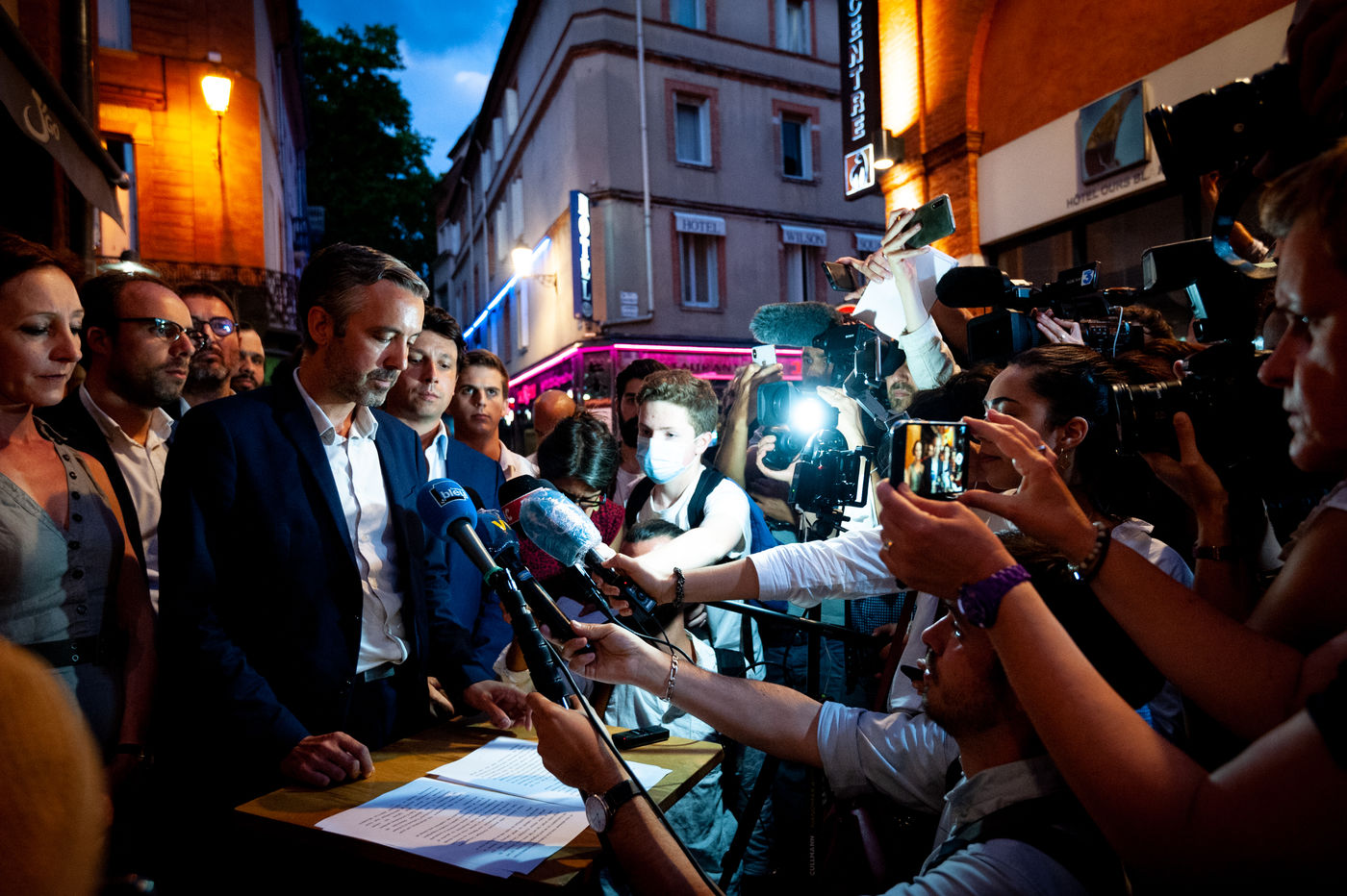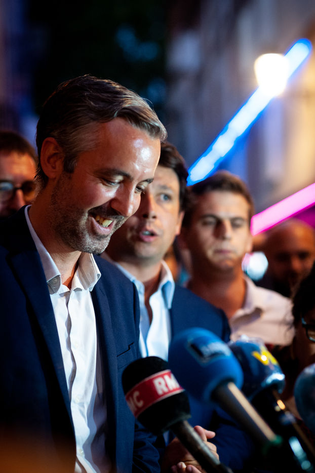 Antoine Maurice, candidate on the Archipel Citoyen list for the 2020 municipal elections, and opponent of the outgoing mayor Jean-Luc Moudenc speaks at the J'GO restaurant after the announcement of the results of the second round, won by the right list.