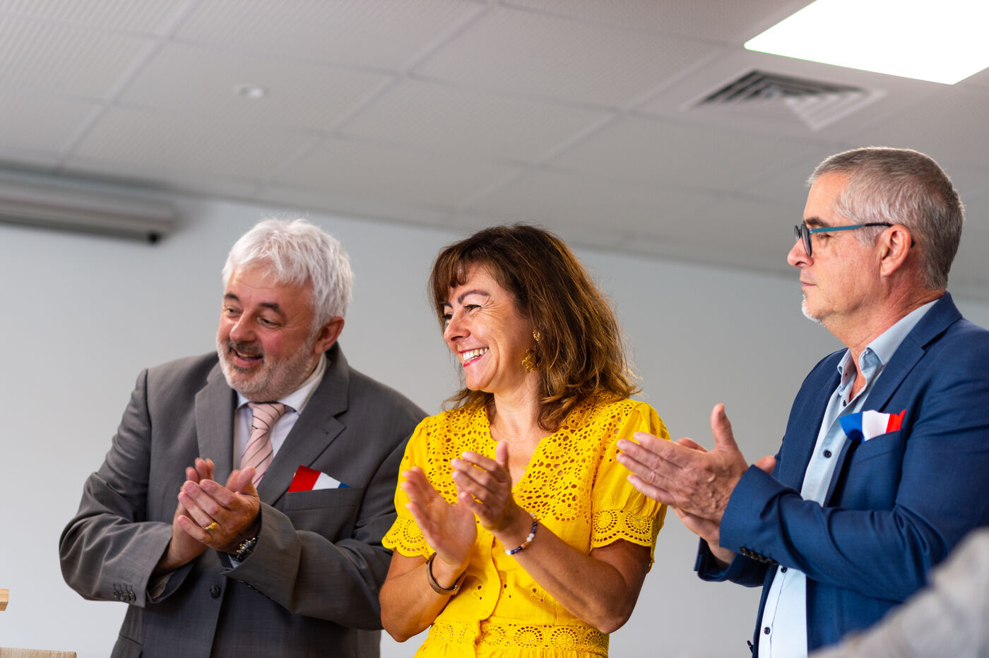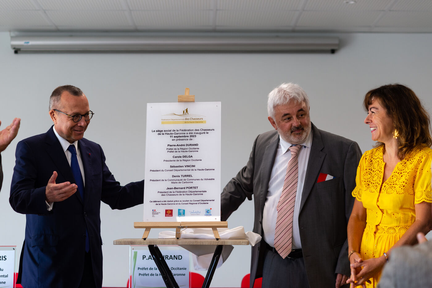 Inauguration du nouveau siège de la Fédération des Chasseurs de la Haute-Garonne à Carbonne (31) le 11 septembre 2023. Etaient présents Carole Delga, Présidente de la région Occitanie, Bernard Bagnéris, Vice-Président du conseil départemental de la Haute-Garonne, et Pierre-André Durand, préfet de la région Occitanie, et de la Haute-Garonne. Jean Bernard Portet, Président de la Fédération des chasseurs de Haute-Garonne, ainsi que Denis Turrel, Président de la Communauté de Communes du Volestre. Invité surprise, Didier Lacroix, président du Stade Toulousain, amateur de chasse.