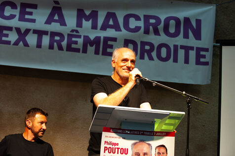 Philippe Poutou's campaign meeting in Carcassonne on July 4, 2024, with his deputy Pauline Salingue, as well as Olivier Besancenot and Hadrien Clouet. Philippe Poutou is running in the Aude department's first constituency against outgoing RN member of parliament Christophe Barthès.