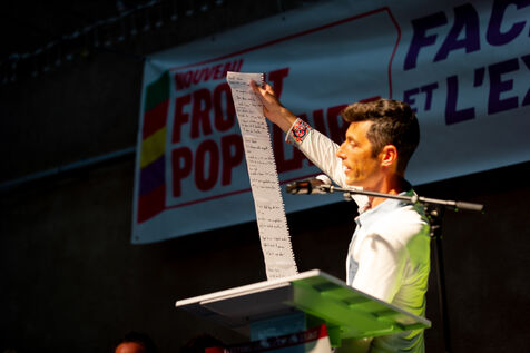 Meeting de campagne de Philippe Poutou à Carcassonne le 4 juillet 2024, accompagné de sa suppléante Pauline Salingue, du porte parole du NPA Olivier Besancenot, d'Hadrien Clouet, candidat NFP-LFI en Haute-Garonne et d'Alix Soler-Alcaraz, premier secrétaire fédéral PS. Philippe Poutou se présente dans la première circonscription de l'Aude face au député sortant RN Christophe Barthès.