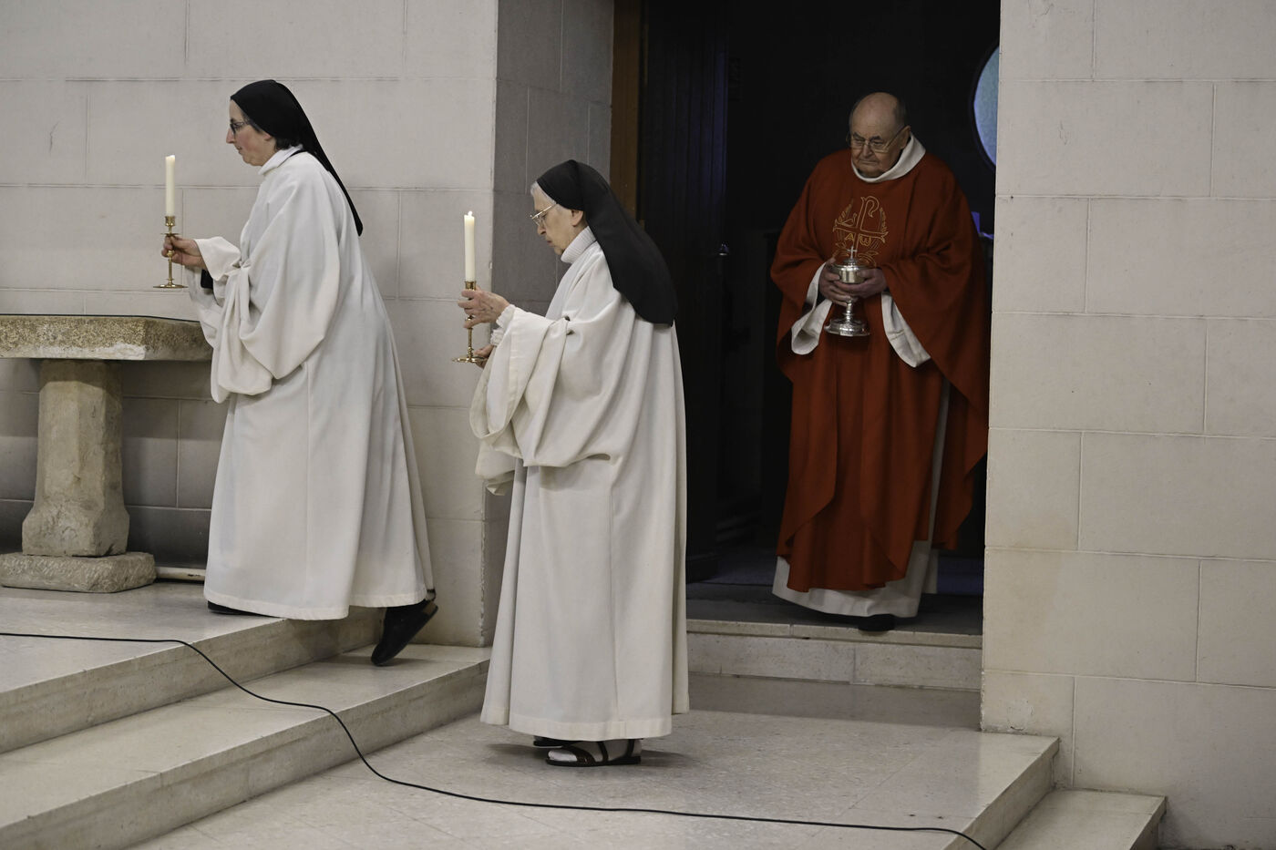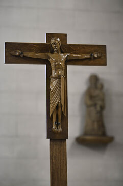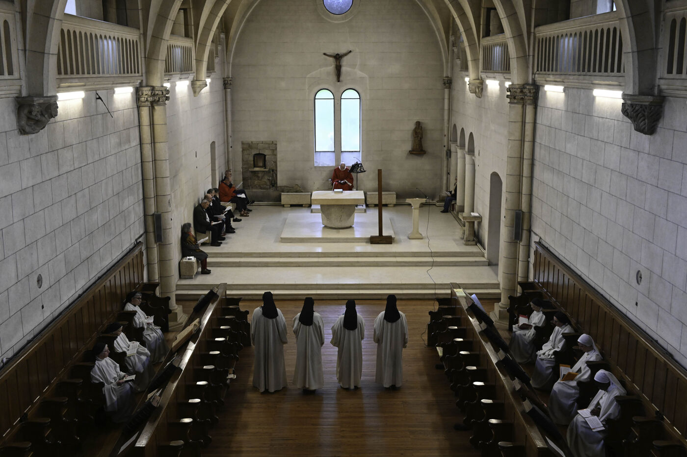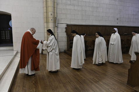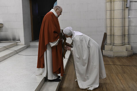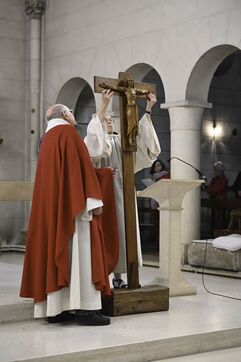At Sainte Marie du Rivet Abbey, Good Friday opens in silence. The entry is marked by a unique gesture during the year: the prostration of the priest. Then, the Cistercian nuns resume singing, prayers and readings with the abbot. Another strong point of the service: the presentation and veneration of the Cross. The celebrant goes to get the Cross then goes back to the altar, pausing in the middle of the church, then the mother abbess and the nuns come to prostrate themselves and kiss the Cross. At the end of the service, a Eucharistic communion takes place where the Cistercian community of the abbey then the faithful present receive the hosts consecrated the day before, during the Maundy Thursday mass.