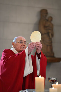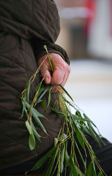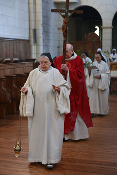 At the Abbey of Sainte Marie du Rivet in Auros, in the Gironde department as in the entire Christian community Palm Sunday celebrates the arrival of Jesus in Jerusalem and also marks the beginning of Holy Week six days before Easter. At the beginning of this celebration the nuns of the abbey and the faithful associated with the service enter the church with branches of boxwood, olive or laurel blessed by the priest officiating at the abbey dressed in a red chasuble symbolizing the love passion and blood shed by Christ. The branches symbolize the palm branches that people placed on Christ's path during his entry into Jerusalem to greet and acclaim him.