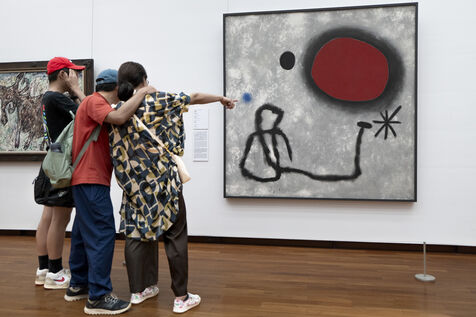 Joan Miró, Painting 1953, National Museum of Western Art in Tokyo, Japan, on 19 September 2024. Built in 1959 by the Franco-Swiss architect Le Corbusier and enlarged since, the museum houses a powerful painting by Joan Miró. Its red disc takes visitors back to the symbolism of the rising sun, the emblem of the Japanese national flag.