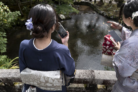 Le selfie est un acte essentiel du tourisme contemporain, en particulier au Japon. Il est même possible d'engager une équipe photos pour immortaliser sa promenade touristique ou les nouveaux mariés dans un jardin public, et louer un kimono pour une visite en costume.