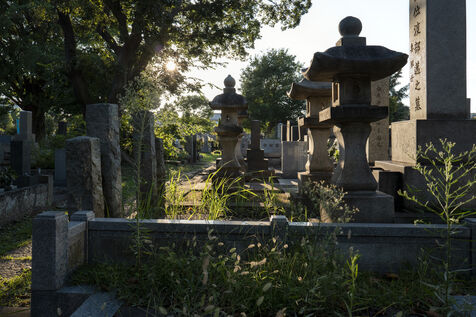 Cemeteries in Japan are often located near residential areas or temples. The repetitive geometry of the alignments of cut stone steles, sometimes in the shape of a lantern, is reminiscent of the geometry of the city in the background.