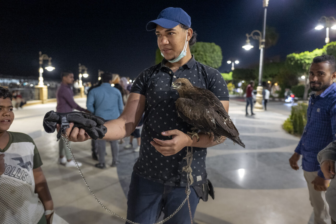 Vendors on the evening promenade along the Nile in Luxor look for tourists who want to be photographed with their hawk. They are an attraction in themselves for locals seeking evening air.