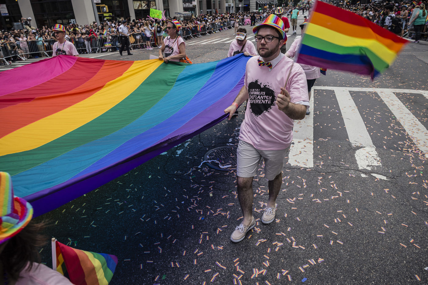 Le 24 juin 2018, la 49 ème Marche annuelle de la Fierté à Manhattan, New York City, commémore les émeutes qui ont éclaté à la suite d'une descente de police dans un bar gay de New York appelé le Stonewall Inn en juin 1969.