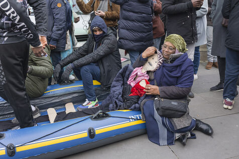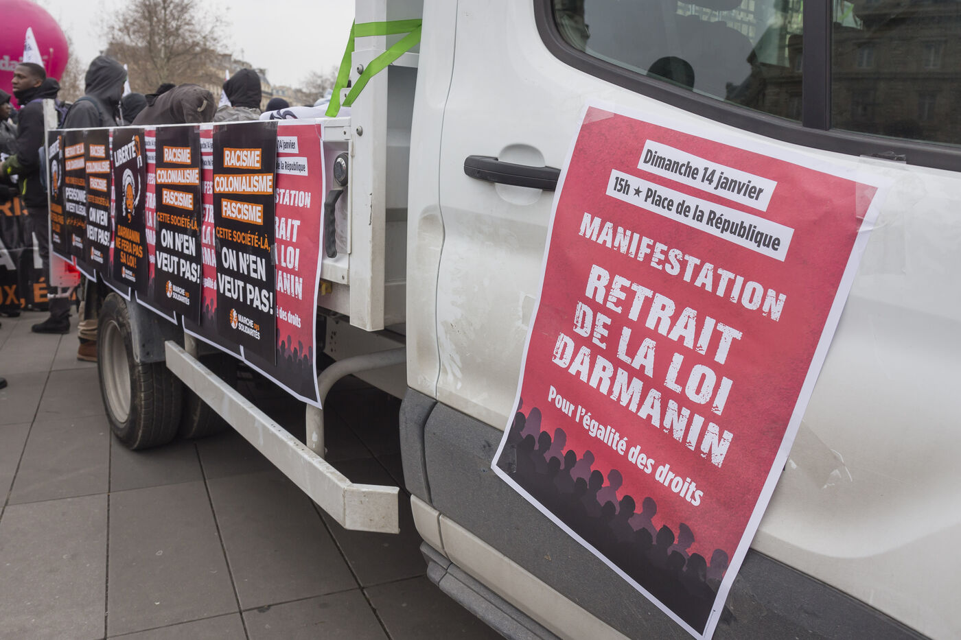 France, Paris, 2024-01-14. Rally at Place de la République in Paris following the call for mobilisation throughout France to withdraw the Immigration Act currently being examined by the Constitutional Council, which is due to give its ruling on 25 January. Photograph by Pascal SONNET / Hans Lucas.