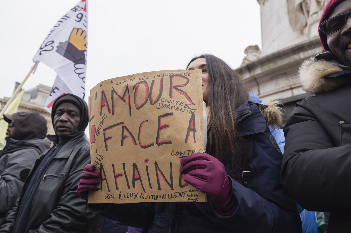 France, Paris, 2024-01-14. Rassemblement à Paris place de la République suite à l appel à la mobilisation dans toute la France pour le retrait du texte sur la loi immigration actuellement examinée par le Conseil constitutionnel, qui doit rendre sa décision le 25 janvier. Photographie de Pascal SONNET / Hans Lucas.