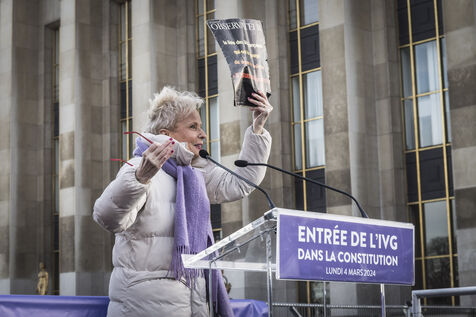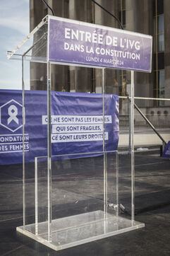 France, Paris, 2024-03-04. Rally at Place du Trocadéro in Paris for the live broadcast of the parliamentary vote to enshrine voluntary interruption of pregnancy (IVG) in the Constitution. Photograph by Pascal SONNET / Hans Lucas.