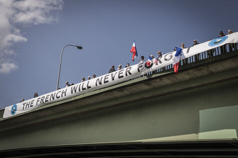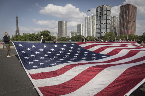 France, Paris, 2024-06-06. The association "The French Will Never Forget", for Franco-American friendship, organized a ceremony on the Pont de Grenelle in Paris on Thursday June 6, 2024, for the 80th anniversary of D-Day. Photograph by Pascal SONNET / Hans Lucas.