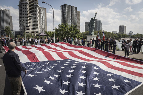 France, Paris, 2024-06-06. L association "The French Will Never Forget", pour l amitié franco-américaine a organisée le jeudi 6 juin 2024 une cérémonie sur le pont de Grenelle à Paris, pour le 80ème anniversaire du débarquement. Photographie de Pascal SONNET / Hans Lucas.