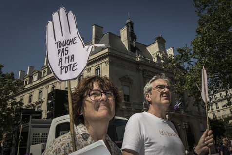 France, Paris, 2024-06-23. Des milliers de manifestants contre l extrême droite ont manifestés à Paris de la place de la République à la place de la Nation, à l appel d associations féministes et de différents syndicats. Photographie de Pascal SONNET / Hans Lucas